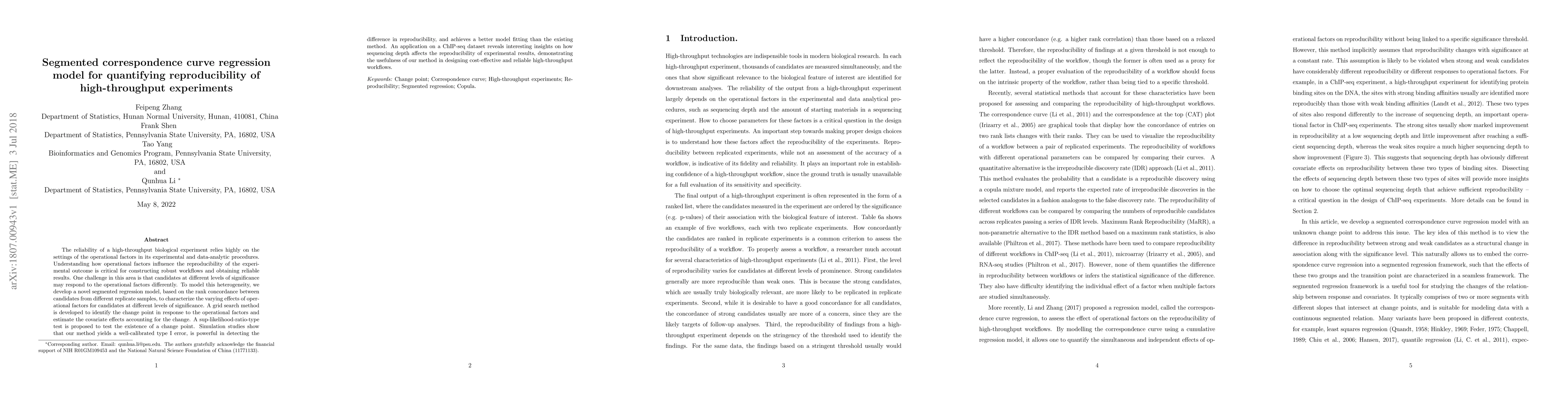 This paper presents a segmented correspondence curve regression model to quantify the reproducibility of high-throughput experiments by accounting for varying effects of operational factors on candidates at different significance levels. The proposed method effectively identifies change points and demonstrates superior performance in simulation studies and practical applications.