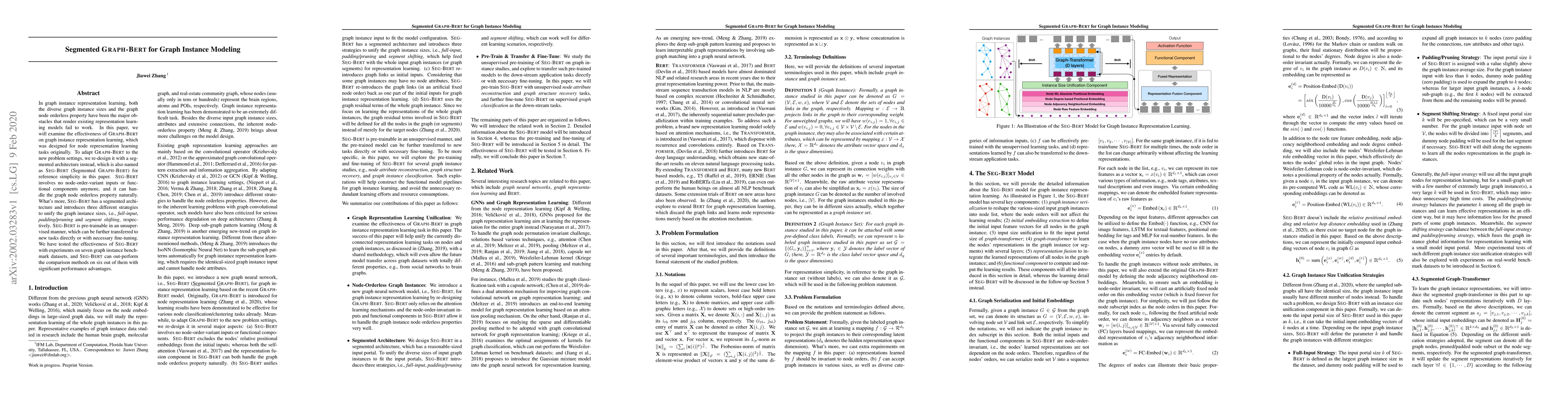 This paper proposes SEG-BERT, a re-designed version of GRAPH-BERT for graph instance representation learning, addressing the challenges of diverse graph sizes and node orderlessness. SEG-BERT employs a segmented architecture and three strategies to unify graph sizes, achieving superior performance on seven benchmark datasets.