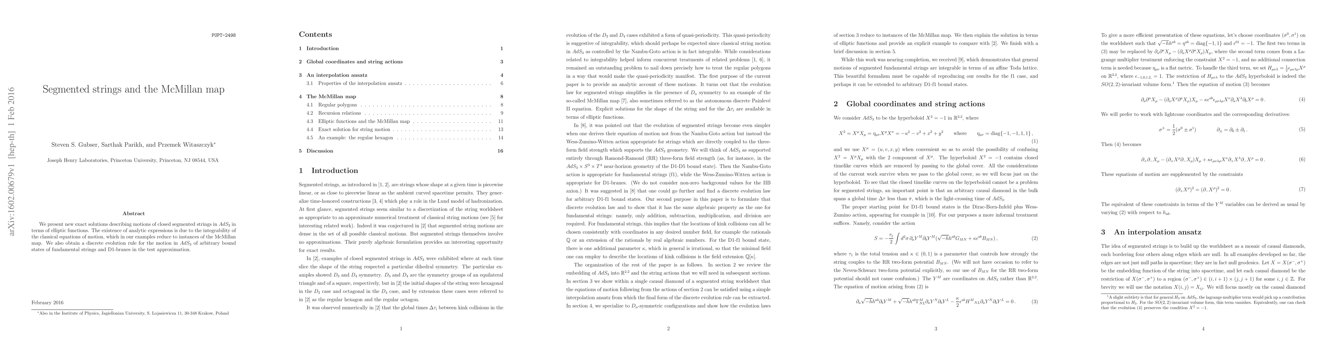This paper provides exact solutions for closed segmented strings in $AdS_3$ using elliptic functions, revealing the integrability of the classical equations of motion linked to the McMillan map. Additionally, it derives a discrete evolution rule for bound states of fundamental strings and D1-branes in $AdS_3$.