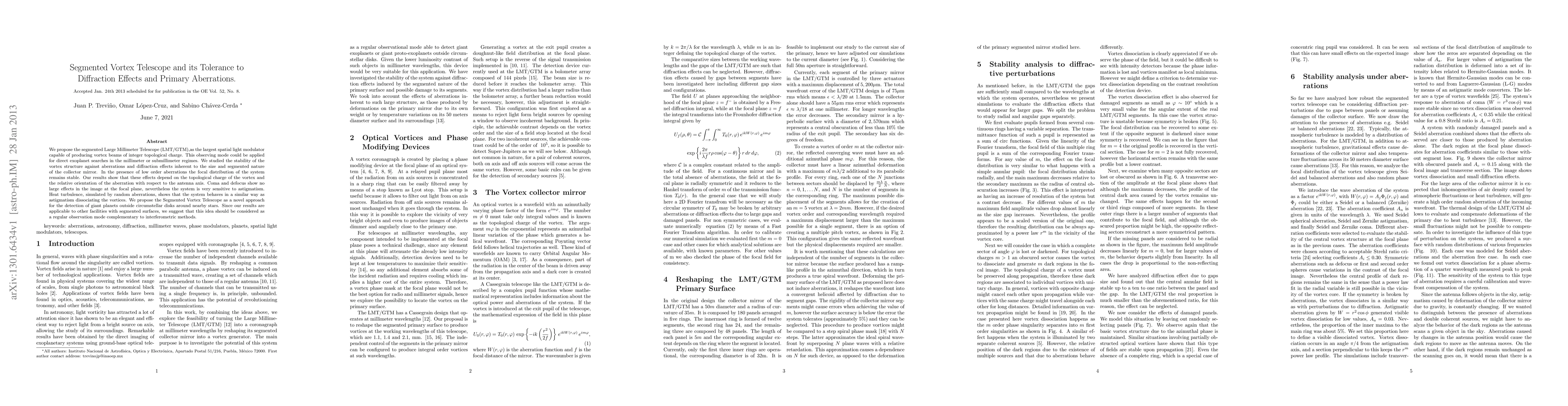We propose the segmented Large Millimeter Telescope (LMT/GTM),as the largest spatial light modulator capable of producing vortex beams of integer topological charge. This observing mode could be applied for direct exoplanet searches in the millimeter or submillimeter regimes. We studied the stability of the vortex structure against aberrations and diffraction effects inherent to the size and segmented nature of the collector mirror. In the presence of low order aberrations the focal distribution of the system remains stable. Our results show that these effects depend on the topological charge of the vortex and the relative orientation of the aberration with respect to the antenna axis. Coma and defocus show no large effects in the image at the focal plane, nevertheless the system is very sensitive to astigmatism. Heat turbulence, simulated by random aberrations, shows that the system behaves in a similar way as astigmatism dissociating the vortices. We propose the Segmented Vortex Telescope as a novel approach for the detection of giant planets outside circumstellar disks around nearby stars. Since our results are applicable to other facilities with segmented surfaces, we suggest that this idea should be considered as a regular observation mode complementary to interferometric methods.