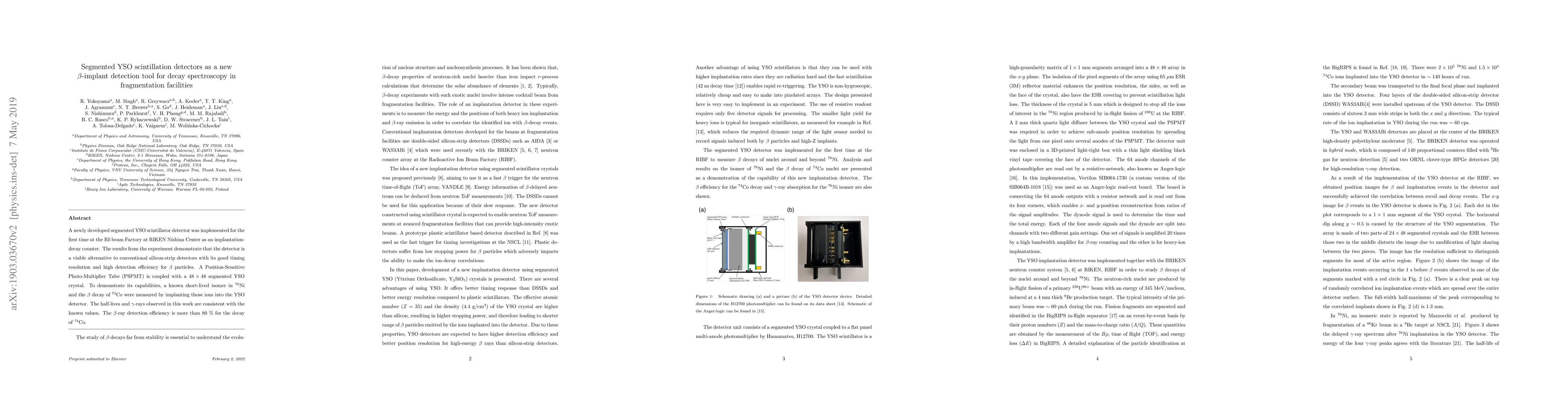 This paper introduces a segmented YSO scintillator detector for $\beta$-implant detection in decay spectroscopy, showing it to be a viable alternative to silicon-strip detectors with high detection efficiency and timing resolution. The detector successfully measured the decay of short-lived isomers in $^{76}$Ni and $\beta$ decay in $^{74}$Co, confirming its effectiveness.