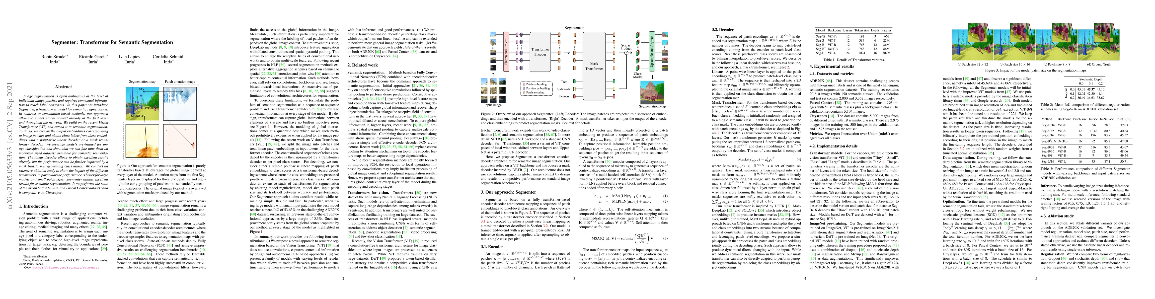 Segmenter is a transformer model for semantic segmentation that leverages global context from the first layer, outperforming convolution-based methods. It uses pre-trained Vision Transformers fine-tuned on segmentation datasets, achieving state-of-the-art results on ADE20K, Pascal Context, and competitive results on Cityscapes.