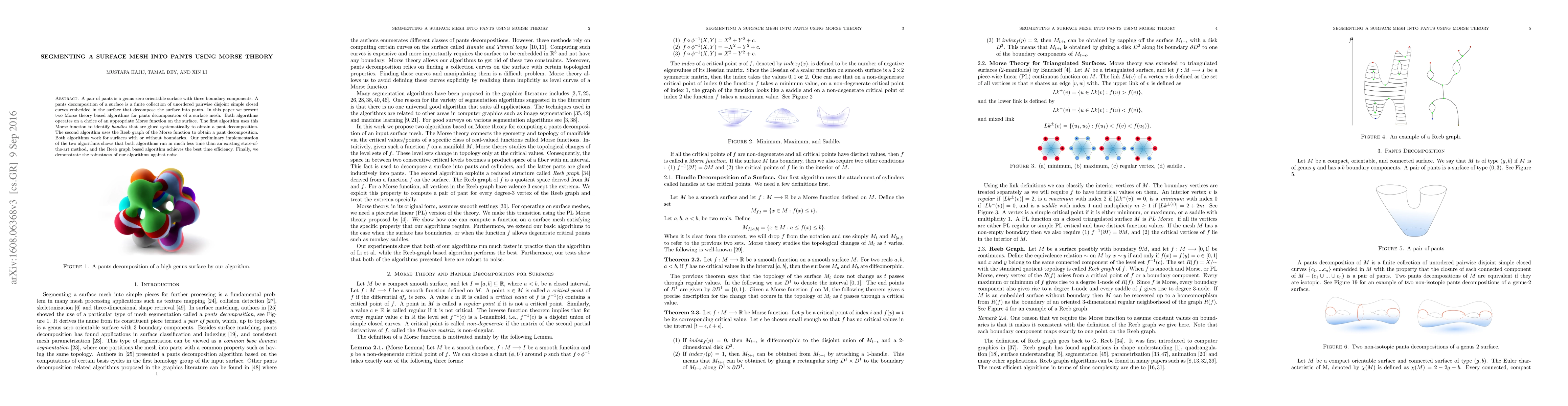 This paper presents two Morse theory-based algorithms for decomposing a surface mesh into pants using a chosen Morse function. The first algorithm identifies handles to systematically obtain a pants decomposition, while the second uses the Reeb graph for this purpose. Both algorithms are efficient and robust against noise, with the Reeb graph-based method showing superior time efficiency.