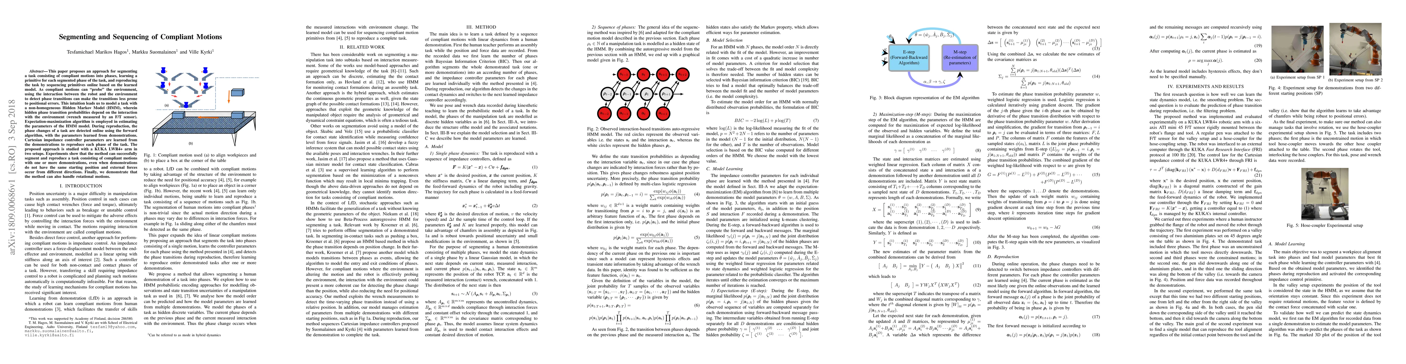 This paper proposes an approach for segmenting a task consisting of compliant motions into phases, learning a primitive for each segmented phase of the task, and reproducing the task by sequencing primitives online based on the learned model. As compliant motions can "probe" the environment, using the interaction between the robot and the environment to detect phase transitions can make the transitions less prone to positional errors. This intuition leads us to model a task with a non-homogeneous Hidden Markov Model (HMM), wherein hidden phase transition probabilities depend on the interaction with the environment (wrench measured by an F/T sensor). Expectation-maximization algorithm is employed in estimating the parameters of the HMM model. During reproduction, the phase changes of a task are detected online using the forward algorithm, with the parameters learned from demonstrations. Cartesian impedance controller parameters are learned from the demonstrations to reproduce each phase of the task. The proposed approach is studied with a KUKA LWR4+ arm in two setups. Experiments show that the method can successfully segment and reproduce a task consisting of compliant motions with one or more demonstrations, even when demonstrations do not have the same starting position and external forces occur from different directions. Finally, we demonstrate that the method can also handle rotational motions.