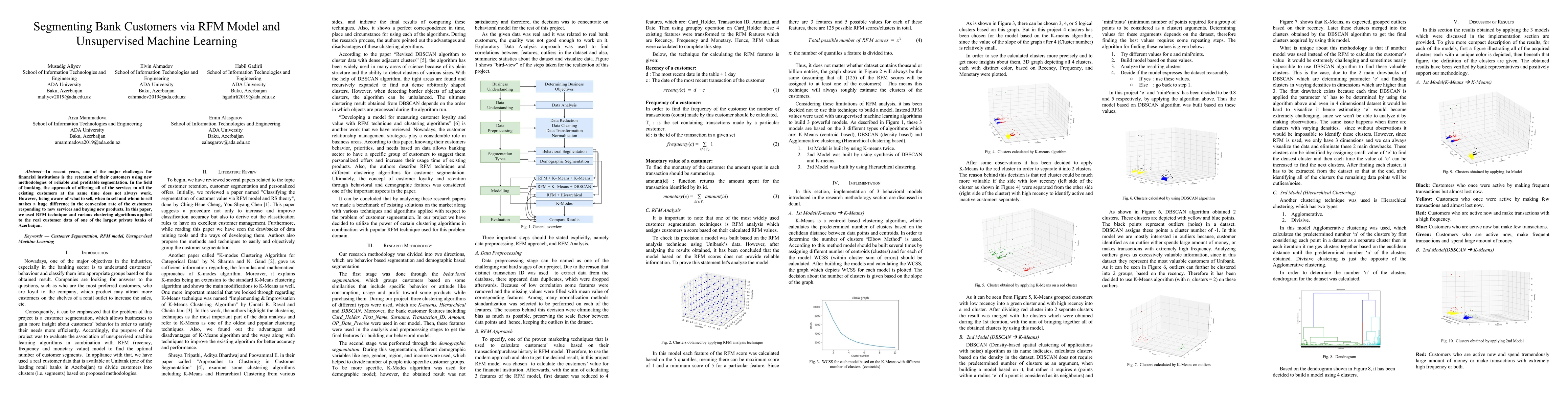 In recent years, one of the major challenges for financial institutions is the retention of their customers using new methodologies of reliable and profitable segmentation. In the field of banking, the approach of offering all of the services to all the existing customers at the same time does not always work. However, being aware of what to sell, when to sell and whom to sell makes a huge difference in the conversion rate of the customers responding to new services and buying new products. In this paper, we used RFM technique and various clustering algorithms applied to the real customer data of one of the largest private banks of Azerbaijan.