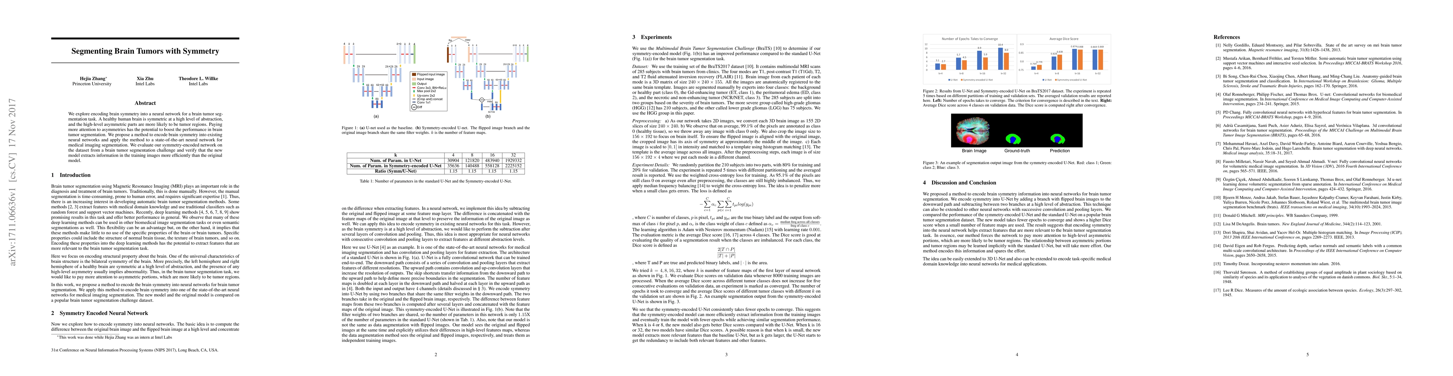 We explore encoding brain symmetry into a neural network for a brain tumor segmentation task. A healthy human brain is symmetric at a high level of abstraction, and the high-level asymmetric parts are more likely to be tumor regions. Paying more attention to asymmetries has the potential to boost the performance in brain tumor segmentation. We propose a method to encode brain symmetry into existing neural networks and apply the method to a state-of-the-art neural network for medical imaging segmentation. We evaluate our symmetry-encoded network on the dataset from a brain tumor segmentation challenge and verify that the new model extracts information in the training images more efficiently than the original model.