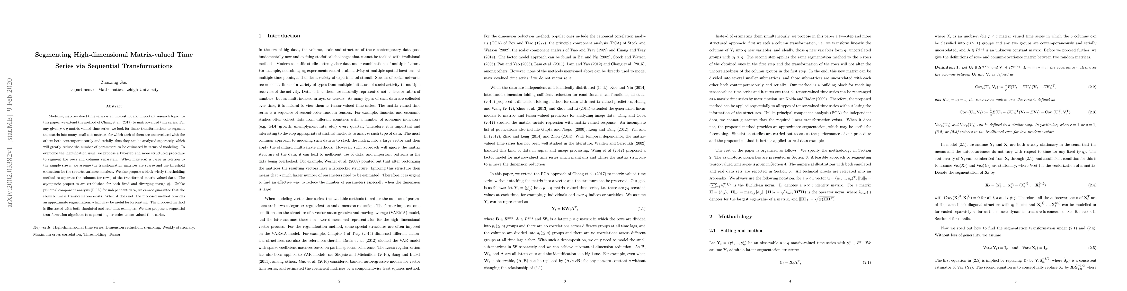 Modeling matrix-valued time series is an interesting and important research topic. In this paper, we extend the method of Chang et al. (2017) to matrix-valued time series. For any given $p\times q$ matrix-valued time series, we look for linear transformations to segment the matrix into many small sub-matrices for which each of them are uncorrelated with the others both contemporaneously and serially, thus they can be analyzed separately, which will greatly reduce the number of parameters to be estimated in terms of modeling. To overcome the identification issue, we propose a two-step and more structured procedure to segment the rows and columns separately. When $\max(p,q)$ is large in relation to the sample size $n$, we assume the transformation matrices are sparse and use threshold estimators for the (auto)covariance matrices. We also propose a block-wisely thresholding method to separate the columns (or rows) of the transformed matrix-valued data. The asymptotic properties are established for both fixed and diverging $\max(p,q)$. Unlike principal component analysis (PCA) for independent data, we cannot guarantee that the required linear transformation exists. When it does not, the proposed method provides an approximate segmentation, which may be useful for forecasting. The proposed method is illustrated with both simulated and real data examples. We also propose a sequential transformation algorithm to segment higher-order tensor-valued time series.