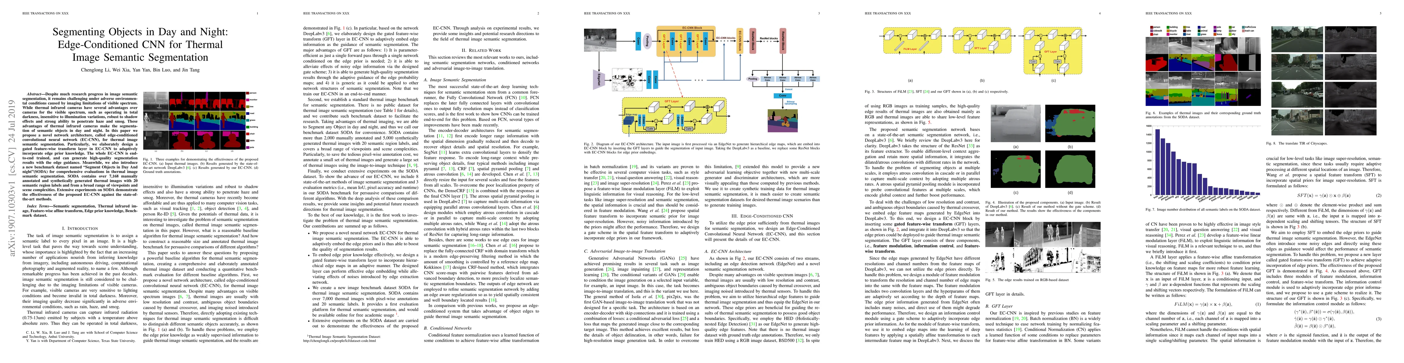 Despite much research progress in image semantic segmentation, it remains challenging under adverse environmental conditions caused by imaging limitations of visible spectrum. While thermal infrared cameras have several advantages over cameras for the visible spectrum, such as operating in total darkness, insensitive to illumination variations, robust to shadow effects and strong ability to penetrate haze and smog. These advantages of thermal infrared cameras make the segmentation of semantic objects in day and night. In this paper, we propose a novel network architecture, called edge-conditioned convolutional neural network (EC-CNN), for thermal image semantic segmentation. Particularly, we elaborately design a gated feature-wise transform layer in EC-CNN to adaptively incorporate edge prior knowledge. The whole EC-CNN is end-to-end trained, and can generate high-quality segmentation results with the edge guidance. Meanwhile, we also introduce a new benchmark dataset named "Segment Objects in Day And night"(SODA) for comprehensive evaluations in thermal image semantic segmentation. SODA contains over 7,168 manually annotated and synthetically generated thermal images with 20 semantic region labels and from a broad range of viewpoints and scene complexities. Extensive experiments on SODA demonstrate the effectiveness of the proposed EC-CNN against the state-of-the-art methods.