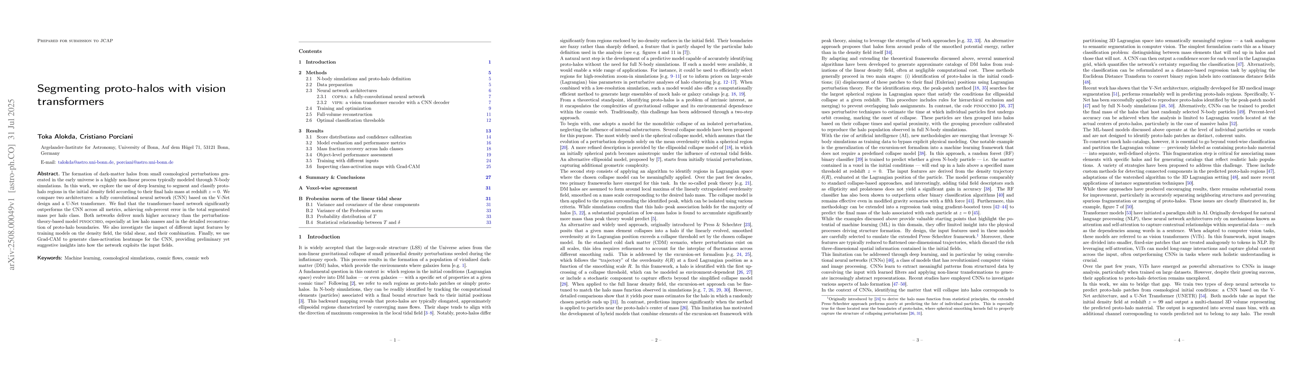The formation of dark-matter halos from small cosmological perturbations generated in the early universe is a highly non-linear process typically modeled through N-body simulations. In this work, we explore the use of deep learning to segment and classify proto-halo regions in the initial density field according to their final halo mass at redshift $z=0$. We compare two architectures: a fully convolutional neural network (CNN) based on the V-Net design and a U-Net transformer. We find that the transformer-based network significantly outperforms the CNN across all metrics, achieving sub-percent error in the total segmented mass per halo class. Both networks deliver much higher accuracy than the perturbation-theory-based model \textsc{pinocchio}, especially at low halo masses and in the detailed reconstruction of proto-halo boundaries. We also investigate the impact of different input features by training models on the density field, the tidal shear, and their combination. Finally, we use Grad-CAM to generate class-activation heatmaps for the CNN, providing preliminary yet suggestive insights into how the network exploits the input fields.