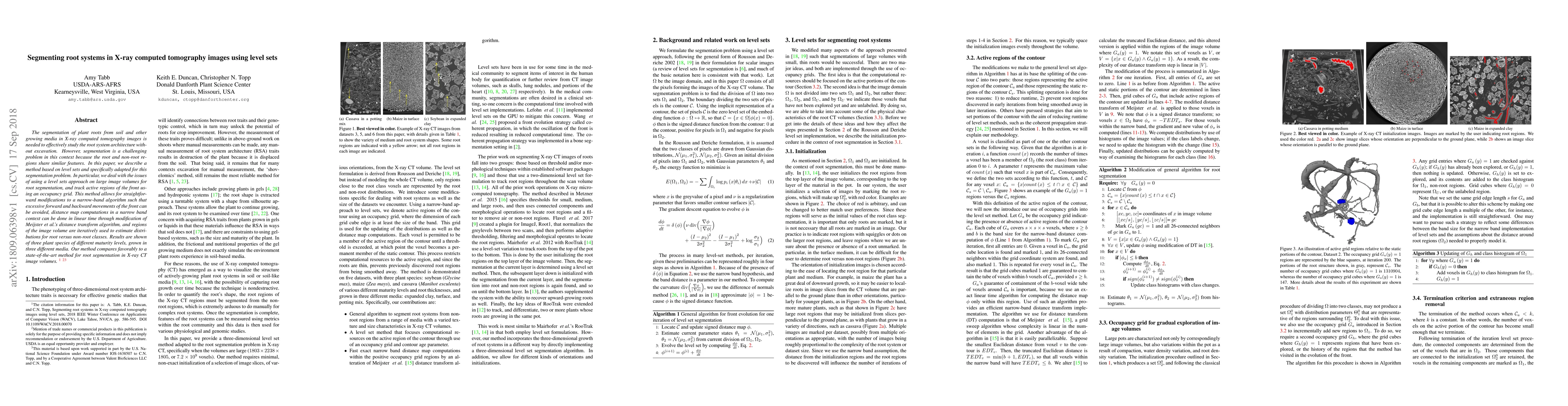 The segmentation of plant roots from soil and other growing media in X-ray computed tomography images is needed to effectively study the root system architecture without excavation. However, segmentation is a challenging problem in this context because the root and non-root regions share similar features. In this paper, we describe a method based on level sets and specifically adapted for this segmentation problem. In particular, we deal with the issues of using a level sets approach on large image volumes for root segmentation, and track active regions of the front using an occupancy grid. This method allows for straightforward modifications to a narrow-band algorithm such that excessive forward and backward movements of the front can be avoided, distance map computations in a narrow band context can be done in linear time through modification of Meijster et al.'s distance transform algorithm, and regions of the image volume are iteratively used to estimate distributions for root versus non-root classes. Results are shown of three plant species of different maturity levels, grown in three different media. Our method compares favorably to a state-of-the-art method for root segmentation in X-ray CT image volumes.