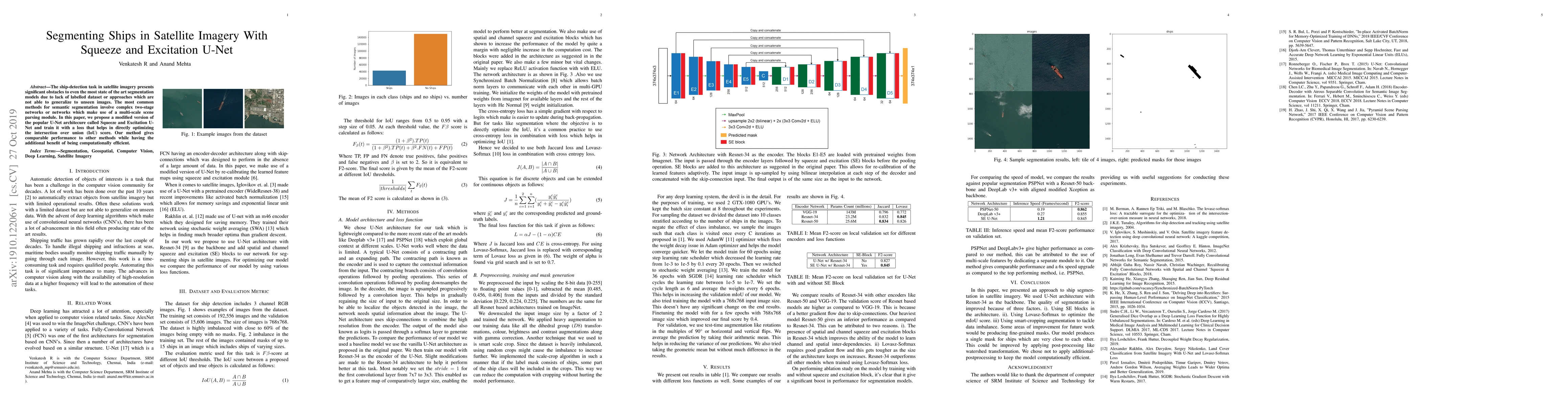 The ship-detection task in satellite imagery presents significant obstacles to even the most state of the art segmentation models due to lack of labelled dataset or approaches which are not able to generalize to unseen images. The most common methods for semantic segmentation involve complex two-stage networks or networks which make use of a multi-scale scene parsing module. In this paper, we propose a modified version of the popular U-Net architecture called Squeeze and Excitation U-Net and train it with a loss that helps in directly optimizing the intersection over union (IoU) score. Our method gives comparable performance to other methods while having the additional benefit of being computationally efficient.