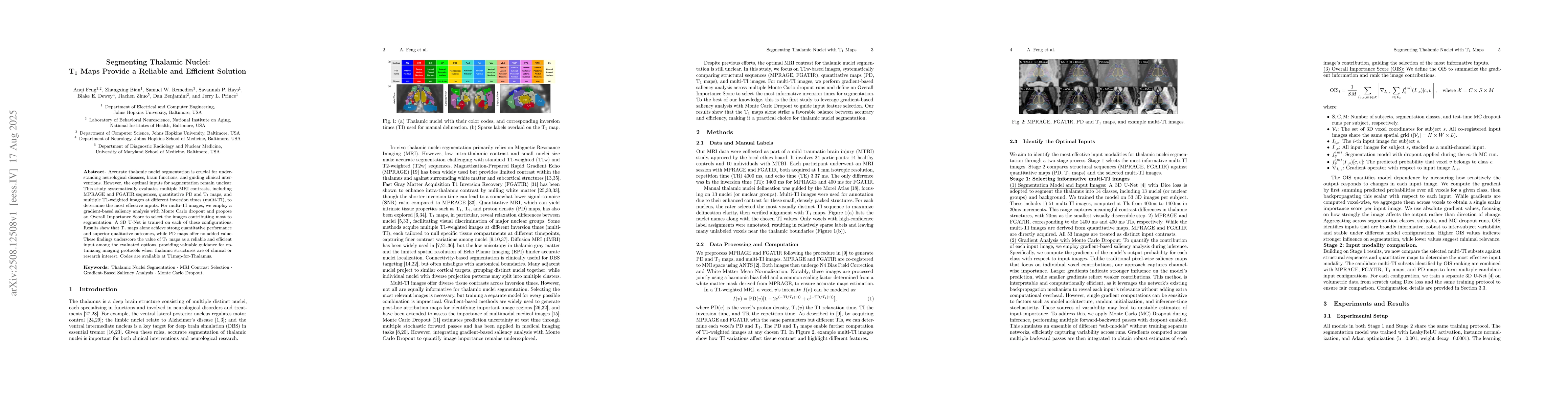 Accurate thalamic nuclei segmentation is crucial for understanding neurological diseases, brain functions, and guiding clinical interventions. However, the optimal inputs for segmentation remain unclear. This study systematically evaluates multiple MRI contrasts, including MPRAGE and FGATIR sequences, quantitative PD and T1 maps, and multiple T1-weighted images at different inversion times (multi-TI), to determine the most effective inputs. For multi-TI images, we employ a gradient-based saliency analysis with Monte Carlo dropout and propose an Overall Importance Score to select the images contributing most to segmentation. A 3D U-Net is trained on each of these configurations. Results show that T1 maps alone achieve strong quantitative performance and superior qualitative outcomes, while PD maps offer no added value. These findings underscore the value of T1 maps as a reliable and efficient input among the evaluated options, providing valuable guidance for optimizing imaging protocols when thalamic structures are of clinical or research interest.