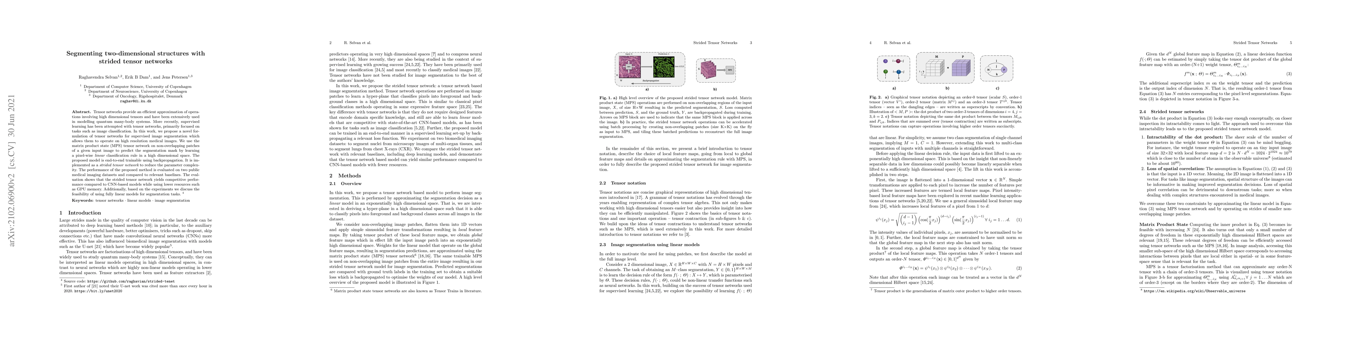 This research introduces a novel tensor network approach for supervised image segmentation, specifically designed for high-resolution medical images. The method employs matrix product states on image patches and is implemented as a Strided Tensor Network to manage parameter complexity, achieving competitive performance with fewer resources compared to CNN-based models.