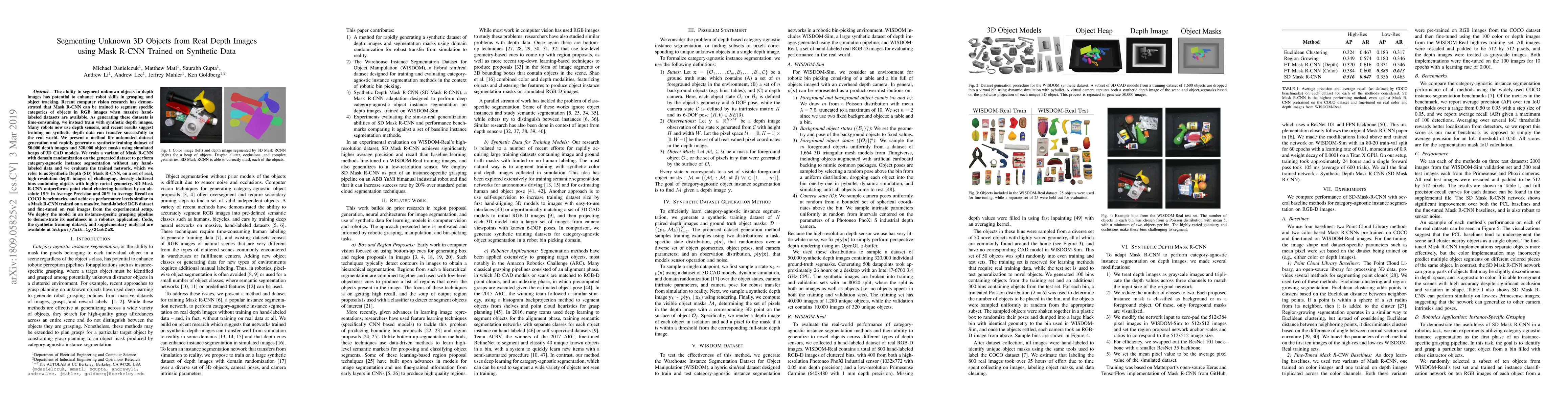 This paper presents a method to segment unknown 3D objects in real depth images using a Mask R-CNN trained on synthetic data, achieving category-agnostic instance segmentation without hand-labeled data. The trained Synthetic Depth Mask R-CNN outperforms baselines and demonstrates effectiveness in a grasping pipeline.