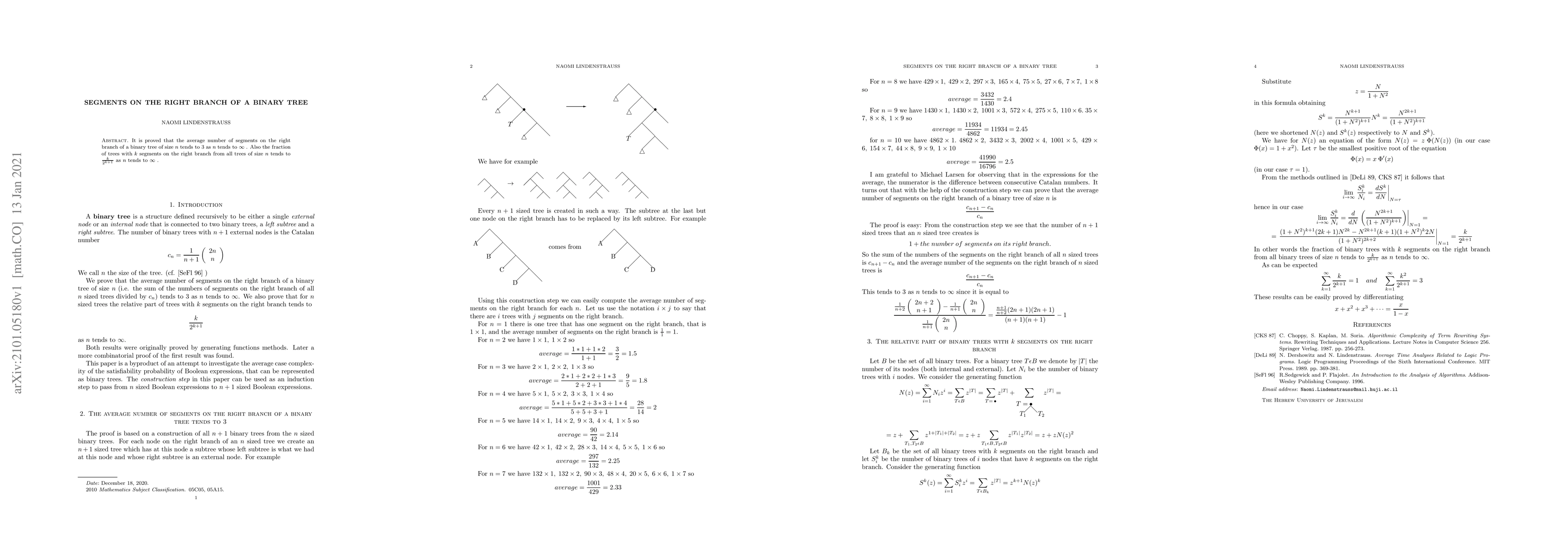 It is proved that the average number of segments on the right branch of a binary tree of size n tends to 3 as n tends to $\infty$. Also the fraction of trees with k segments on the right branch from all trees of size n tends to $\frac{k}{2^{k+1}}$ as n tends to $\infty$