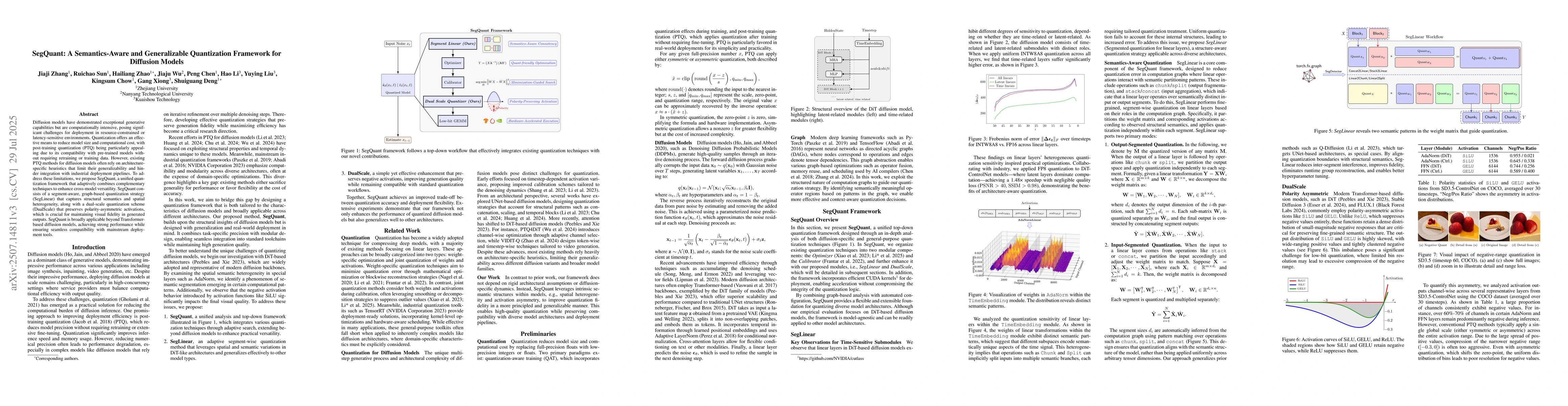 Diffusion models have demonstrated exceptional generative capabilities but are computationally intensive, posing significant challenges for deployment in resource-constrained or latency-sensitive environments. Quantization offers an effective means to reduce model size and computational cost, with post-training quantization (PTQ) being particularly appealing due to its compatibility with pre-trained models without requiring retraining or training data. However, existing PTQ methods for diffusion models often rely on architecture-specific heuristics that limit their generalizability and hinder integration with industrial deployment pipelines. To address these limitations, we propose SegQuant, a unified quantization framework that adaptively combines complementary techniques to enhance cross-model versatility. SegQuant consists of a segment-aware, graph-based quantization strategy (SegLinear) that captures structural semantics and spatial heterogeneity, along with a dual-scale quantization scheme (DualScale) that preserves polarity-asymmetric activations, which is crucial for maintaining visual fidelity in generated outputs. SegQuant is broadly applicable beyond Transformer-based diffusion models, achieving strong performance while ensuring seamless compatibility with mainstream deployment tools.