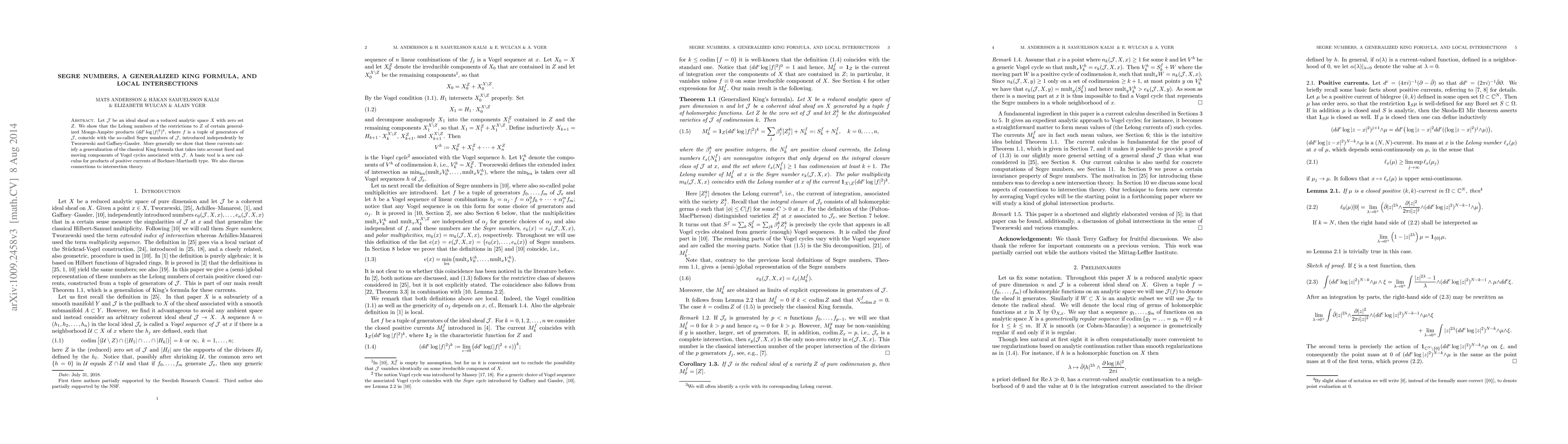 This paper establishes a connection between Lelong numbers of generalized Monge-Ampère products and Segre numbers of an ideal sheaf on a reduced analytic space, proving a generalized King formula for Vogel cycles. It introduces a new calculus for products of positive currents and discusses implications for intersection theory.