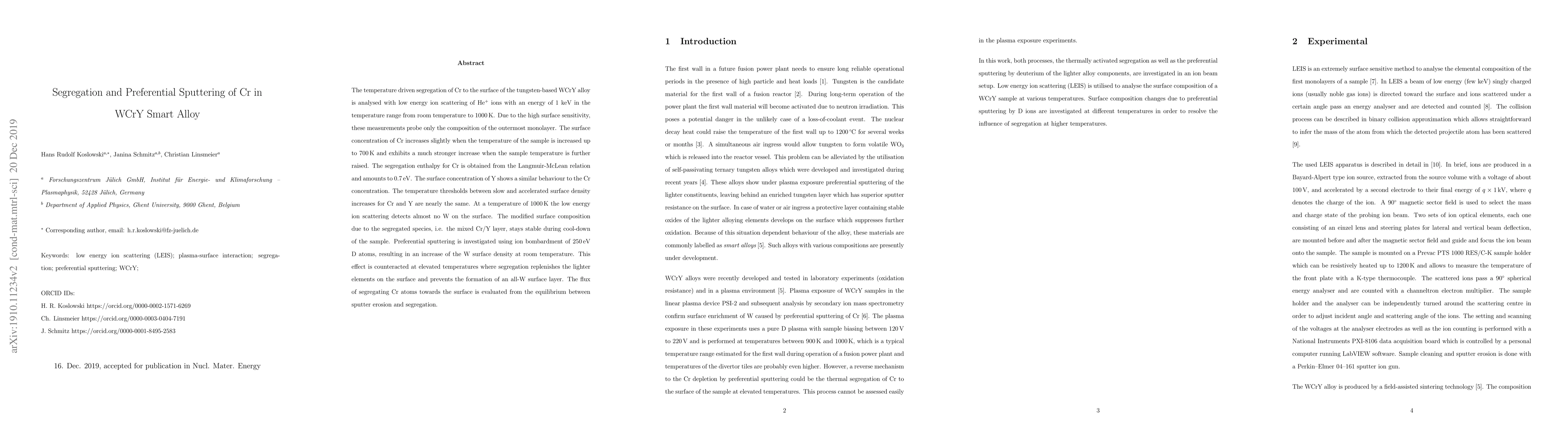 The temperature driven segregation of Cr to the surface of the tungsten-based WCrY alloy is analysed with low energy ion scattering of He+ ions with an energy of 1 keV in the temperature range from room temperature to 1000 K. Due to the high surface sensitivity, these measurements probe only the composition of the outermost monolayer. The surface concentration of Cr increases slightly when the temperature of the sample is increased up to 700 K and exhibits a much stronger increase when the sample temperature is further raised. The segregation enthalpy for Cr is obtained from the Langmuir-McLean relation and amounts to 0.7 eV. The surface concentration of Y shows a similar behaviour to the Cr concentration. The temperature thresholds between slow and accelerated surface density increases for Cr and Y are nearly the same. At a temperature of 1000 K the low energy ion scattering detects almost no W on the surface. The modified surface composition due to the segregated species, i.e. the mixed Cr/Y layer, stays stable during cool-down of the sample. Preferential sputtering is investigated using ion bombardment of 250 eV D atoms, resulting in an increase of the W surface density at room temperature. This effect is counteracted at elevated temperatures where segregation replenishes the lighter elements on the surface and prevents the formation of an all-W surface layer. The flux of segregating Cr atoms towards the surface is evaluated from the equilibrium between sputter erosion and segregation.