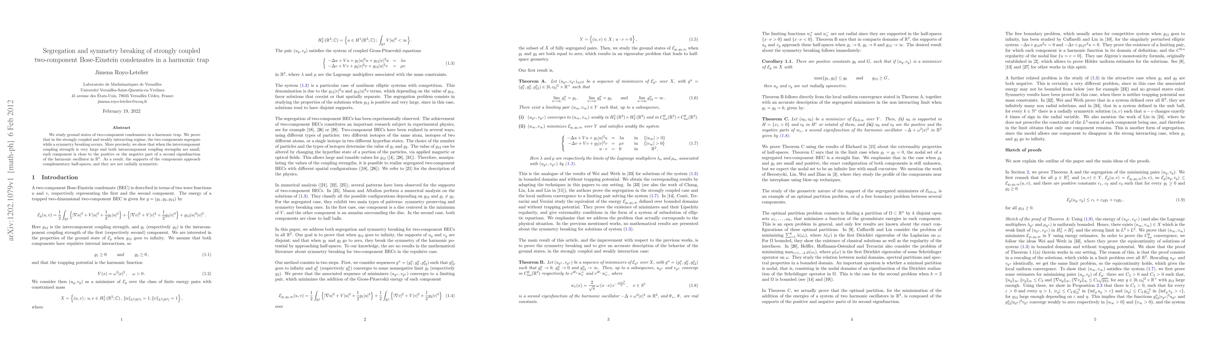 In a two-component Bose-Einstein condensate in a harmonic trap, strong intercomponent coupling leads to segregation and symmetry breaking, where each component approaches complementary half-spaces rather than being radially symmetric.