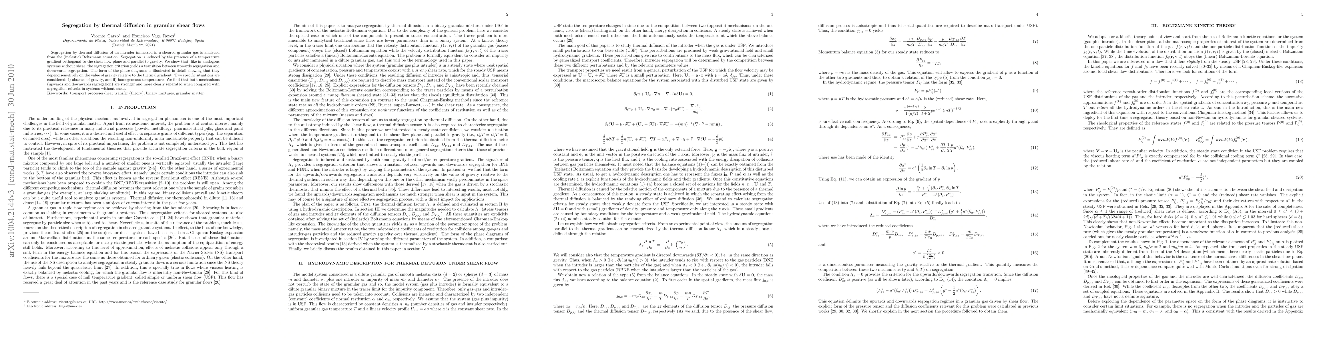 This paper analyzes segregation induced by thermal diffusion in granular shear flows using the Boltzmann equation, revealing a transition between upward and downward segregation based on gravity and thermal gradient values. The study finds that segregation mechanisms are more pronounced and distinct in sheared systems compared to non-sheared systems.