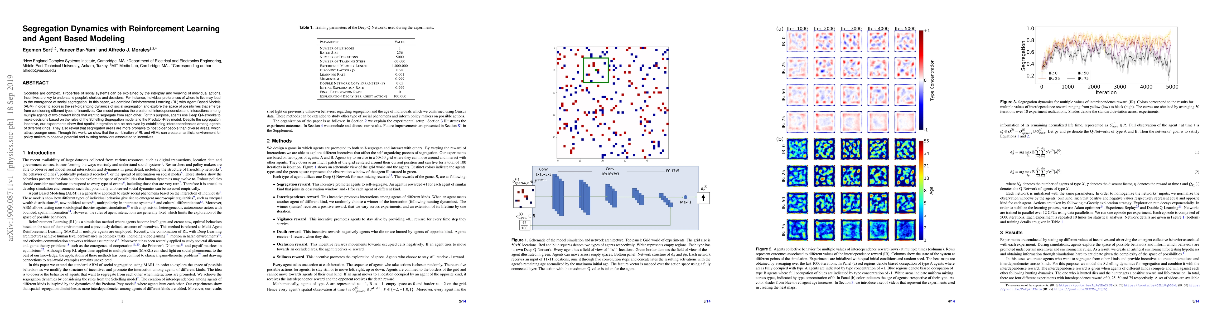 Societies are complex. Properties of social systems can be explained by the interplay and weaving of individual actions. Incentives are key to understand people's choices and decisions. For instance, individual preferences of where to live may lead to the emergence of social segregation. In this paper, we combine Reinforcement Learning (RL) with Agent Based Models (ABM) in order to address the self-organizing dynamics of social segregation and explore the space of possibilities that emerge from considering different types of incentives. Our model promotes the creation of interdependencies and interactions among multiple agents of two different kinds that want to segregate from each other. For this purpose, agents use Deep Q-Networks to make decisions based on the rules of the Schelling Segregation model and the Predator-Prey model. Despite the segregation incentive, our experiments show that spatial integration can be achieved by establishing interdependencies among agents of different kinds. They also reveal that segregated areas are more probable to host older people than diverse areas, which attract younger ones. Through this work, we show that the combination of RL and ABMs can create an artificial environment for policy makers to observe potential and existing behaviors associated to incentives.