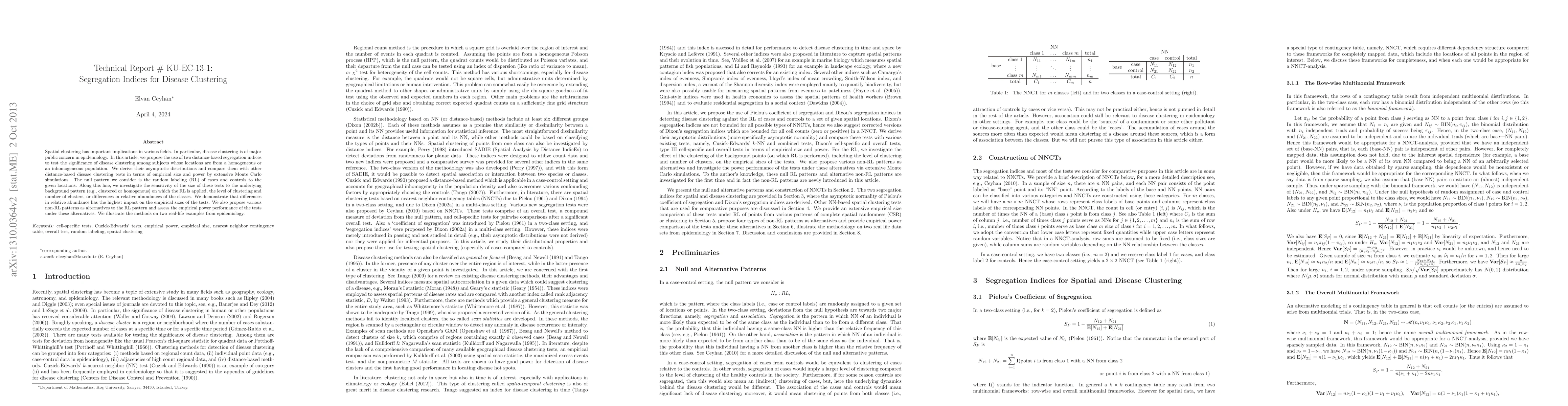 This paper proposes two distance-based segregation indices to assess disease clustering significance in populations, deriving their asymptotic distributions and comparing them via Monte Carlo simulations. The study highlights the impact of relative abundance differences on test sizes and evaluates alternative non-random labeling patterns for better empirical power.