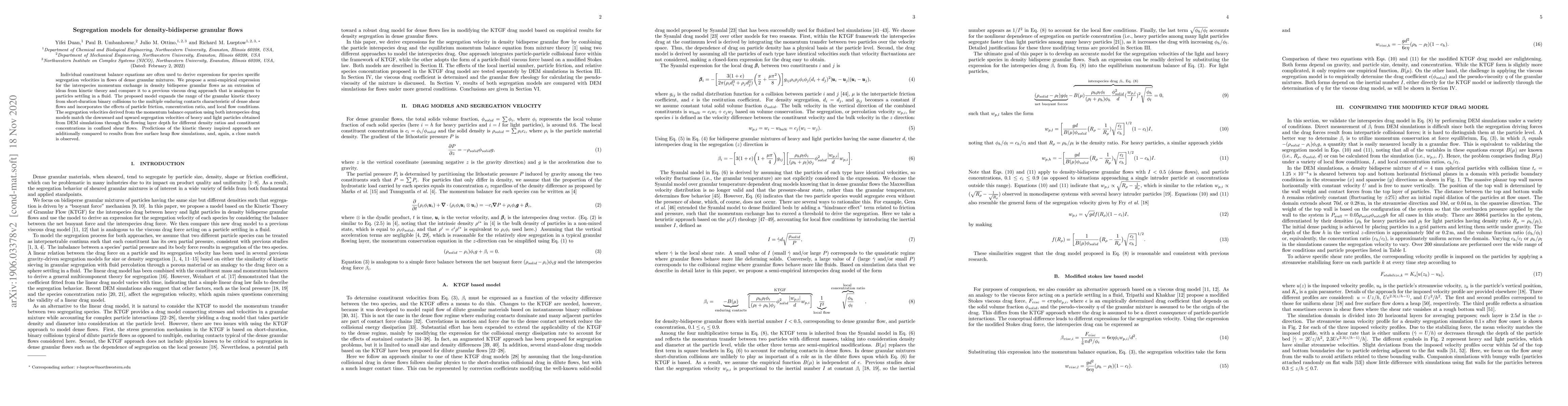 The paper proposes a semi-empirical predictive model (Eqs. (10) and (11)) for segregation velocities of light and heavy particle species in density-bidisperse granular flows, based on a new model for interspecies drag in segregating dense flows (Eq. (8)). The model considers local flow conditions, inertial number (I), local concentration ratio, particle properties, and enduring contacts characterized by interparticle friction.