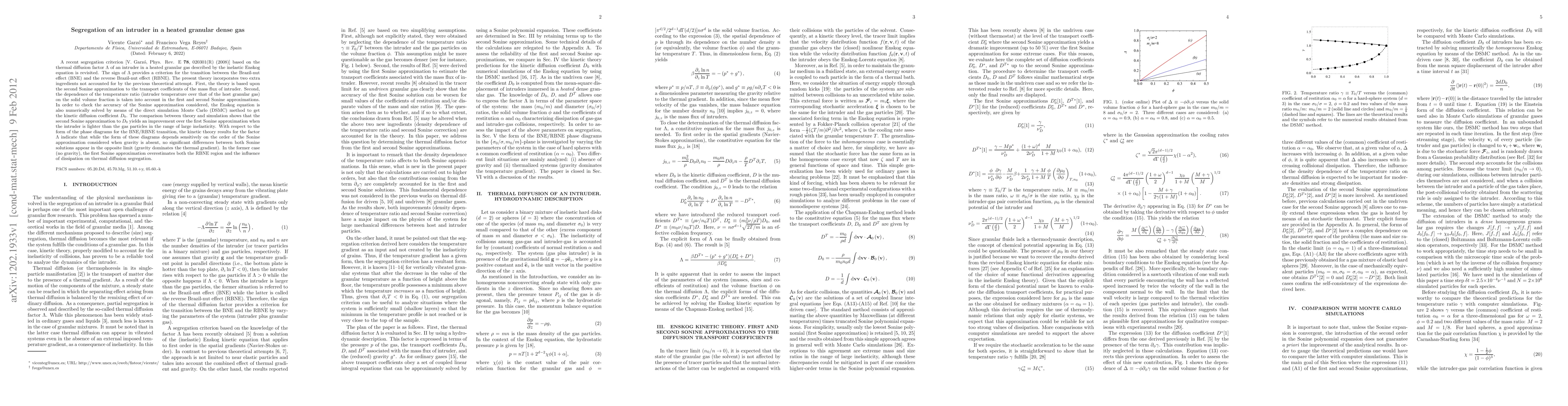 This paper revisits a segregation criterion for an intruder in a heated granular dense gas using the thermal diffusion factor $\Lambda$. The study improves upon previous theories by incorporating the second Sonine approximation and the temperature ratio dependence on solid volume fraction. Numerical simulations confirm the enhanced accuracy of the second Sonine approximation over the first, especially for lighter intruders and high inelasticity.