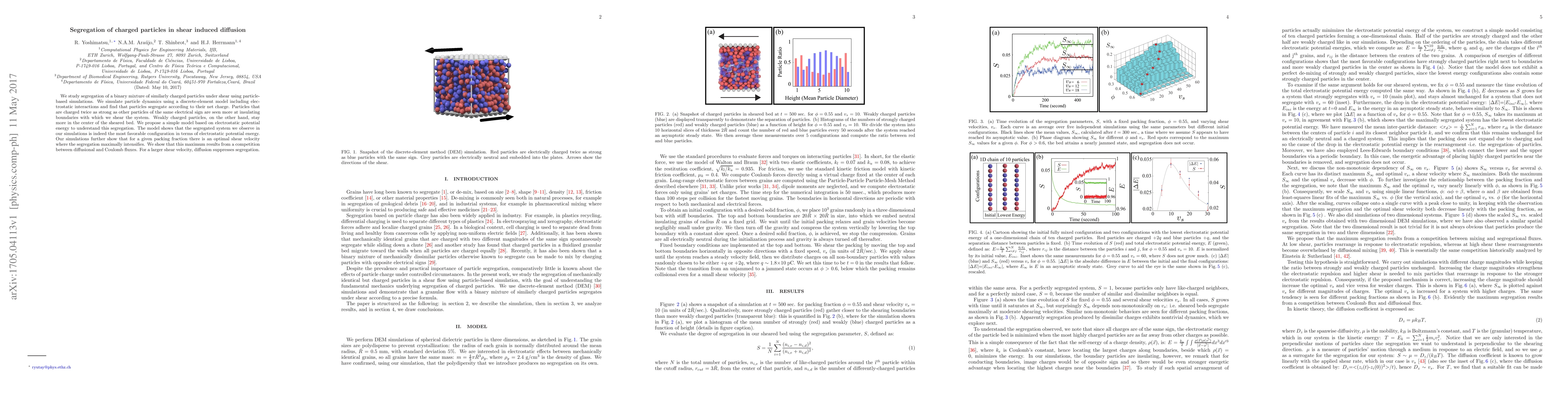 Research shows that charged particles in a mixture segregate according to their net charge when subjected to shear, with highly charged particles accumulating at boundaries and weakly charged particles staying central. The segregation is found to be optimal at a specific shear velocity.