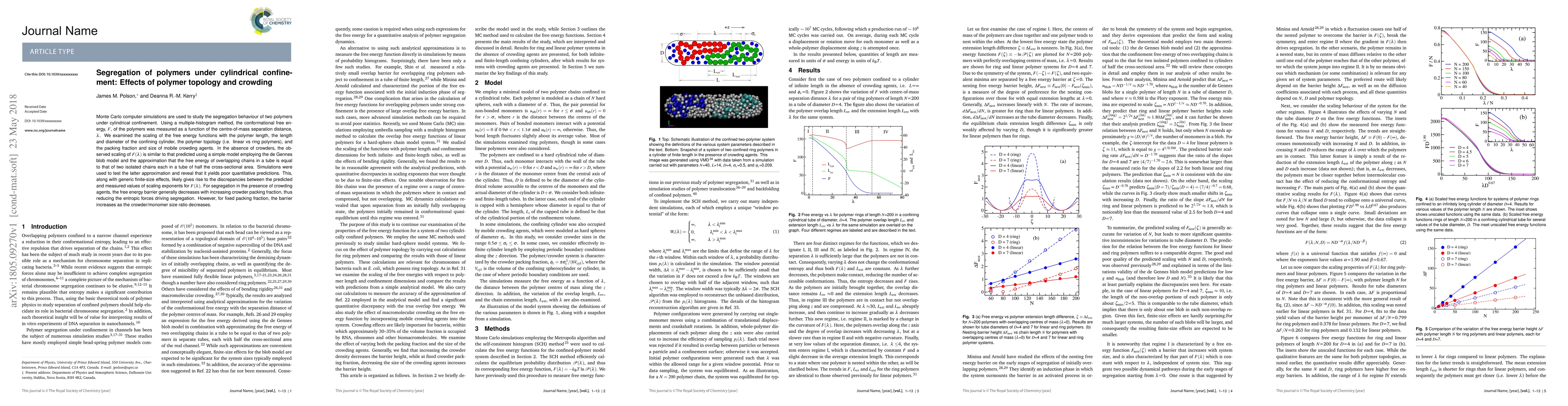 Monte Carlo simulations reveal polymer segregation behavior under cylindrical confinement, influenced by polymer length, topology (linear vs. ring), and presence of crowding agents, which reduce segregation entropic forces with higher packing fractions. Discrepancies in predicted vs. measured scaling of free energy arise from finite-size effects and model approximations.
