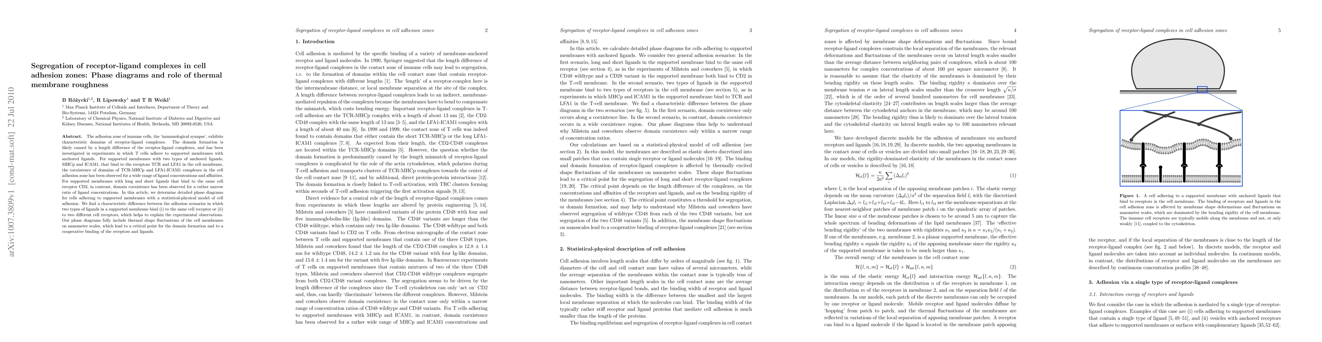 This paper investigates the segregation of receptor-ligand complexes in immune cell adhesion zones, termed 'immunological synapses', using phase diagrams and statistical-physical models. It finds distinct domain formation behaviors depending on whether ligands bind to the same or different cell receptors, influenced by thermal membrane roughness.