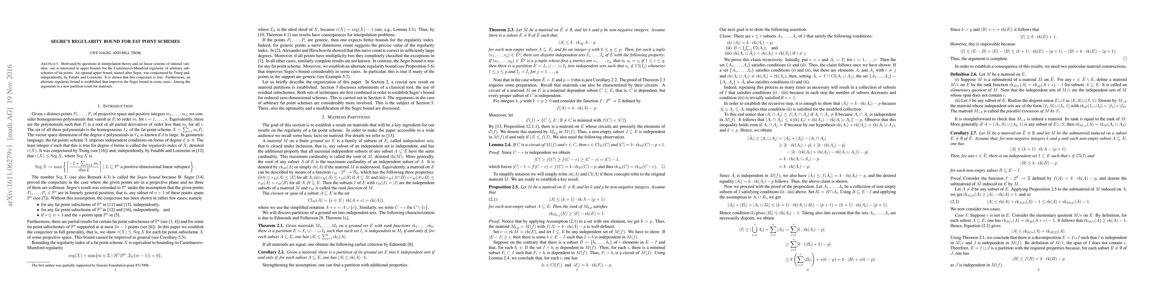The paper presents a proof of Segre's conjecture for fat point schemes and introduces an improved regularity bound, leveraging matroid theory and a novel partition result.