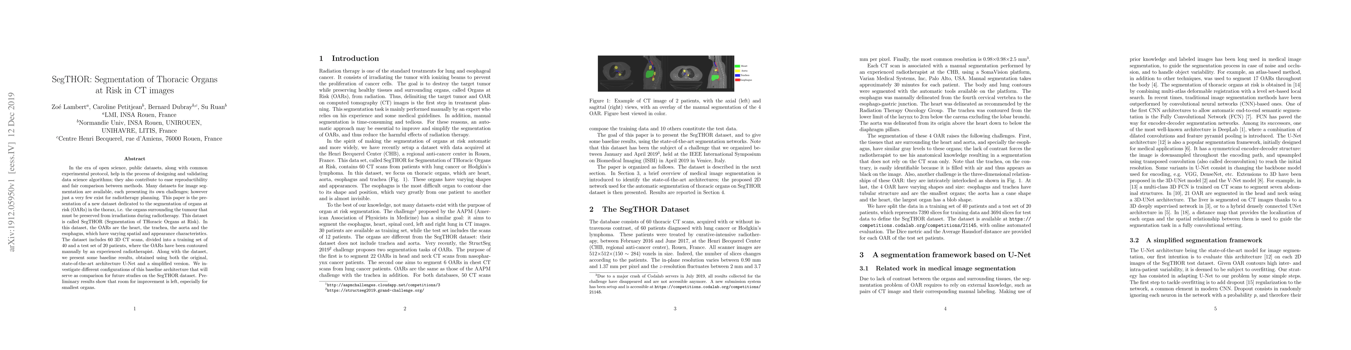 In the era of open science, public datasets, along with common experimental protocol, help in the process of designing and validating data science algorithms; they also contribute to ease reproductibility and fair comparison between methods. Many datasets for image segmentation are available, each presenting its own challenges; however just a very few exist for radiotherapy planning. This paper is the presentation of a new dataset dedicated to the segmentation of organs at risk (OARs) in the thorax, i.e. the organs surrounding the tumour that must be preserved from irradiations during radiotherapy. This dataset is called SegTHOR (Segmentation of THoracic Organs at Risk). In this dataset, the OARs are the heart, the trachea, the aorta and the esophagus, which have varying spatial and appearance characteristics. The dataset includes 60 3D CT scans, divided into a training set of 40 and a test set of 20 patients, where the OARs have been contoured manually by an experienced radiotherapist. Along with the dataset, we present some baseline results, obtained using both the original, state-of-the-art architecture U-Net and a simplified version. We investigate different configurations of this baseline architecture that will serve as comparison for future studies on the SegTHOR dataset. Preliminary results show that room for improvement is left, especially for smallest organs.