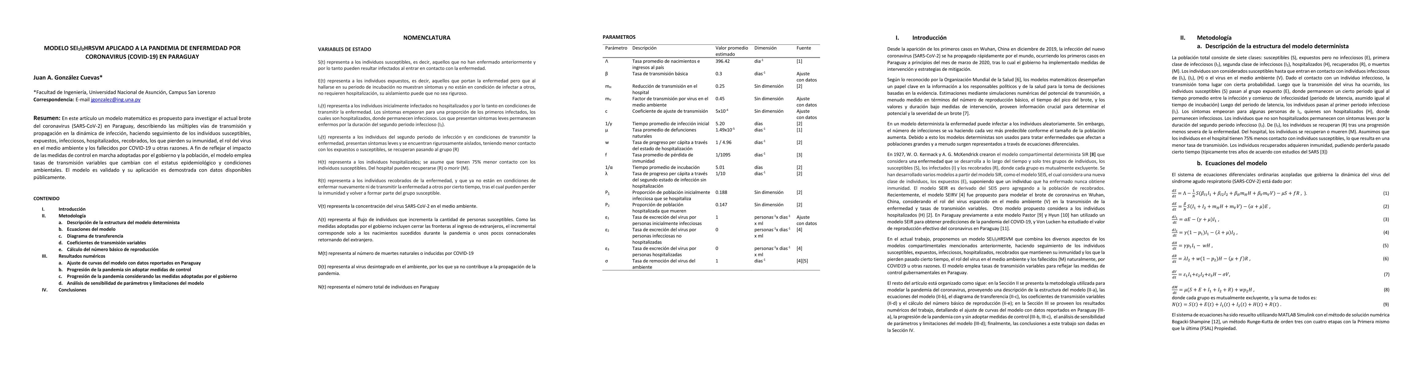 The paper proposes a mathematical model, SEI1I2HRSVM, to study SARS-CoV-2 transmission in Paraguay, accounting for various infection stages and environmental factors. The model, validated with public data, demonstrates the impact of control measures through variable transmission rates.