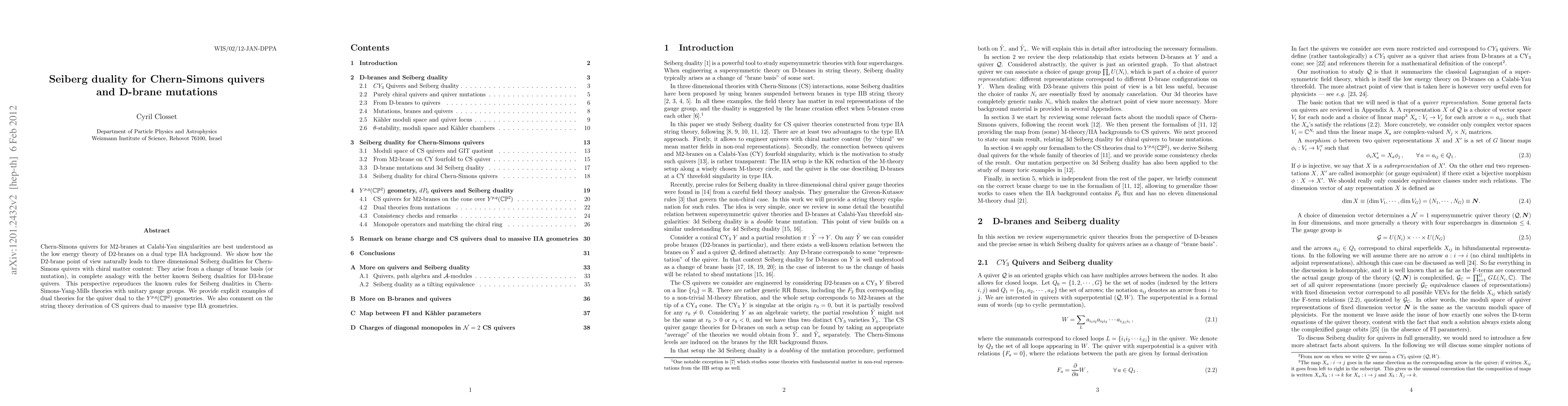 Chern-Simons quivers for M2-branes at Calabi-Yau singularities are best understood as the low energy theory of D2-branes on a dual type IIA background. We show how the D2-brane point of view naturally leads to three dimensional Seiberg dualities for Chern-Simons quivers with chiral matter content: They arise from a change of brane basis (or mutation), in complete analogy with the better known Seiberg dualities for D3-brane quivers. This perspective reproduces the known rules for Seiberg dualities in Chern-Simons-Yang-Mills theories with unitary gauge groups. We provide explicit examples of dual theories for the quiver dual to the Y^{p,q}(CP^2) geometries. We also comment on the string theory derivation of CS quivers dual to massive type IIA geometries.