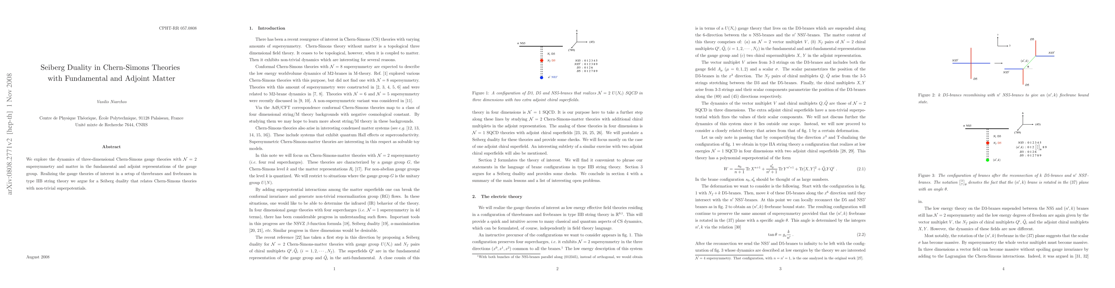 The paper investigates three-dimensional Chern-Simons gauge theories with N=2 supersymmetry and matter in fundamental and adjoint representations, arguing for a Seiberg duality that connects these theories in a string theory setup involving threebranes and fivebranes. This duality relates Chern-Simons theories with non-trivial superpotentials.