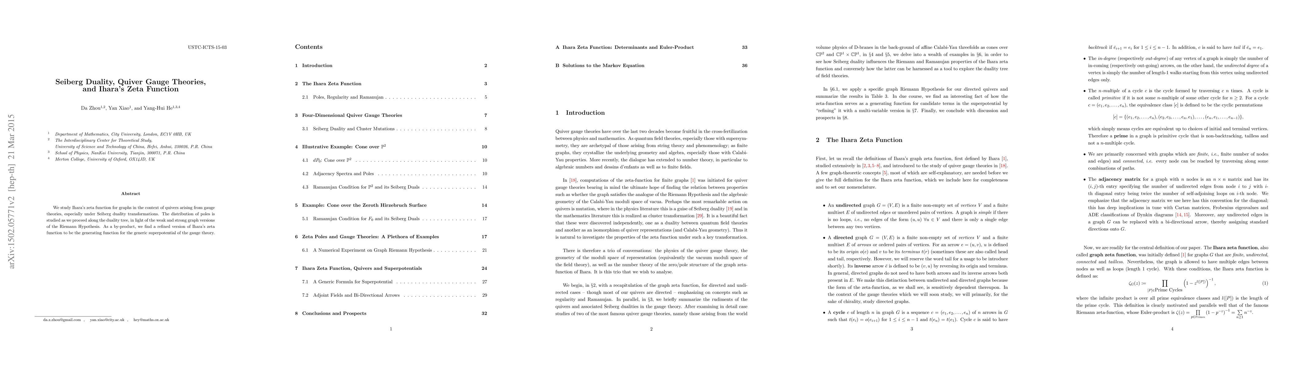 We study Ihara zeta function for graphs in the context of quivers arising from gauge theories, especially under Seiberg duality transformations. The distribution of poles is studied as we proceed along the duality tree, in light of the weak and strong graph versions of the Riemann Hypothesis. As a by-product, we find a refined version of Ihara zeta function to be the generating function for the generic superpotential of the gauge theory.