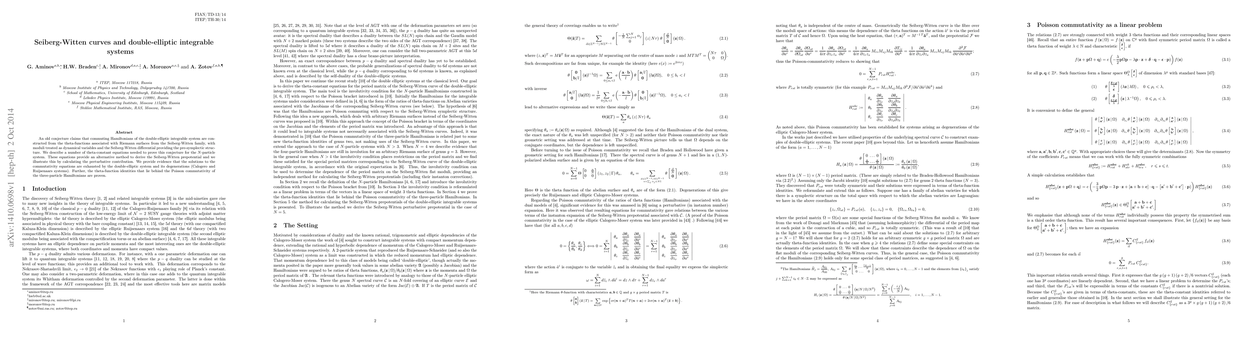 An old conjecture claims that commuting Hamiltonians of the double-elliptic integrable system are constructed from the theta-functions associated with Riemann surfaces from the Seiberg-Witten family, with moduli treated as dynamical variables and the Seiberg-Witten differential providing the pre-symplectic structure. We describe a number of theta-constant equations needed to prove this conjecture for the $N$-particle system. These equations provide an alternative method to derive the Seiberg-Witten prepotential and we illustrate this by calculating the perturbative contribution. We provide evidence that the solutions to the commutativity equations are exhausted by the double-elliptic system and its degenerations (Calogero and Ruijsenaars systems). Further, the theta-function identities that lie behind the Poisson commutativity of the three-particle Hamiltonians are proven.