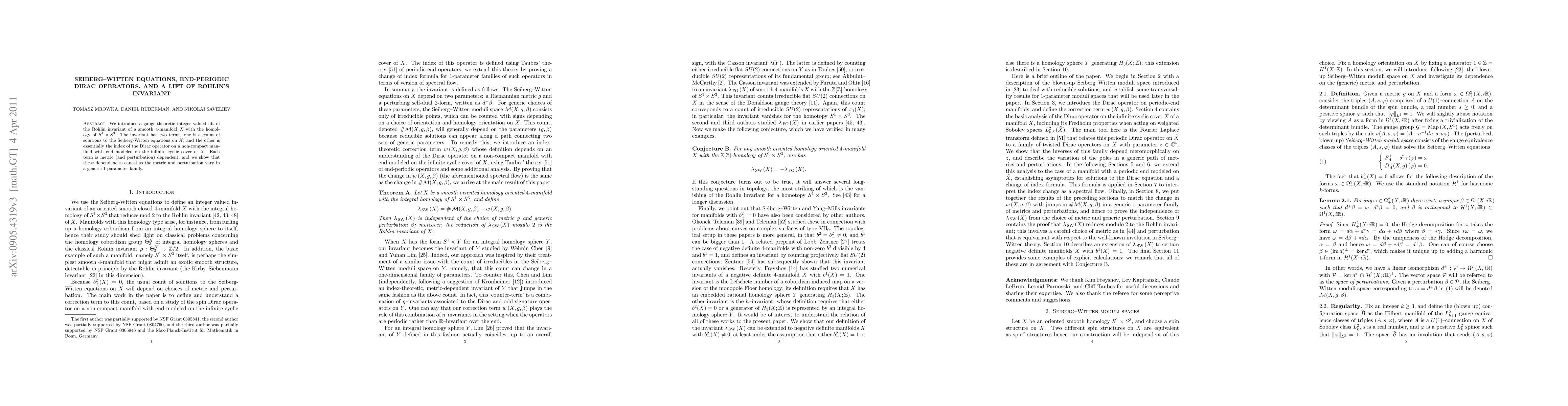 We introduce a gauge-theoretic integer lift of the Rohlin invariant of a smooth 4-manifold X with the homology of $S^1 \times S^3$. The invariant has two terms; one is a count of solutions to the Seiberg-Witten equations on X, and the other is essentially the index of the Dirac operator on a non-compact manifold with end modeled on the infinite cyclic cover of X. Each term is metric (and perturbation) dependent, and we show that these dependencies cancel as the metric and perturbation vary in a 1-parameter family.