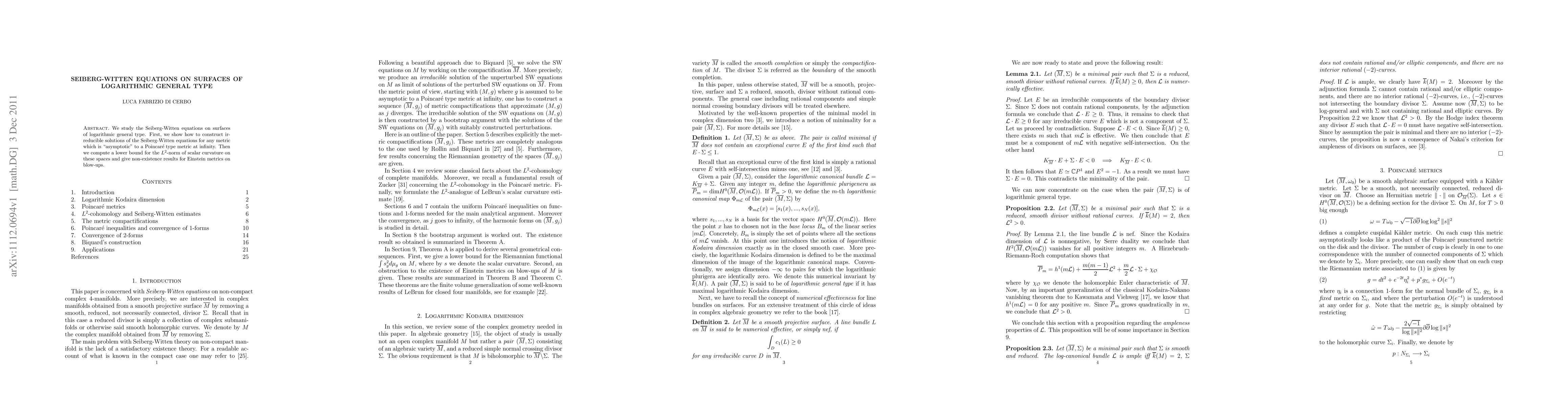 Summary: The paper investigates Seiberg-Witten equations on surfaces of logarithmic general type, constructing irreducible solutions for "asymptotic" Poincaré metrics and establishing a lower bound for the $L^{2}$-norm of scalar curvature, while proving non-existence of Einstein metrics on blow-ups.