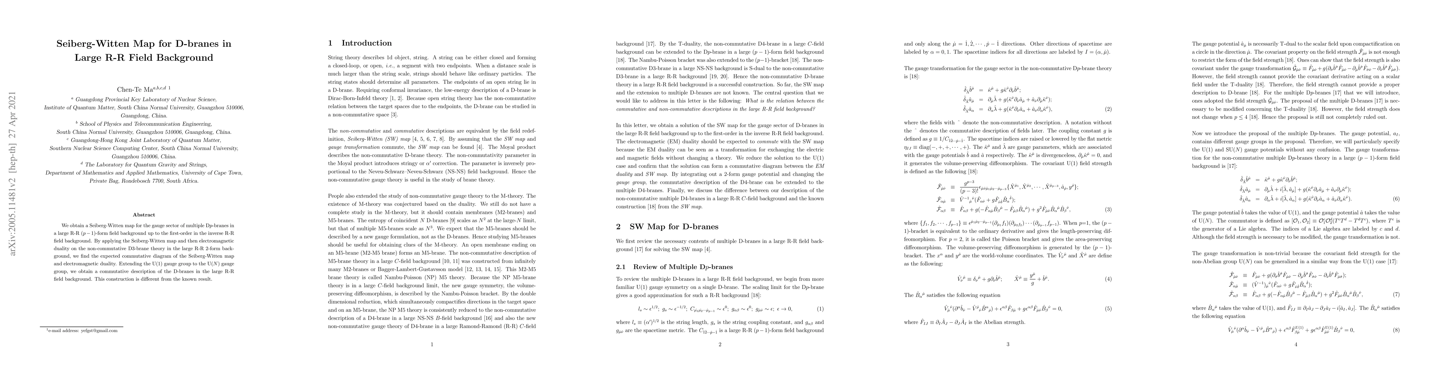 The research provides a Seiberg-Witten map for D$p$-branes in large R-R field backgrounds up to first order in the inverse field. It reveals a commutative diagram of the Seiberg-Witten map and electromagnetic duality, extending the construction to the U($N$) gauge group, offering a novel description of D-branes.