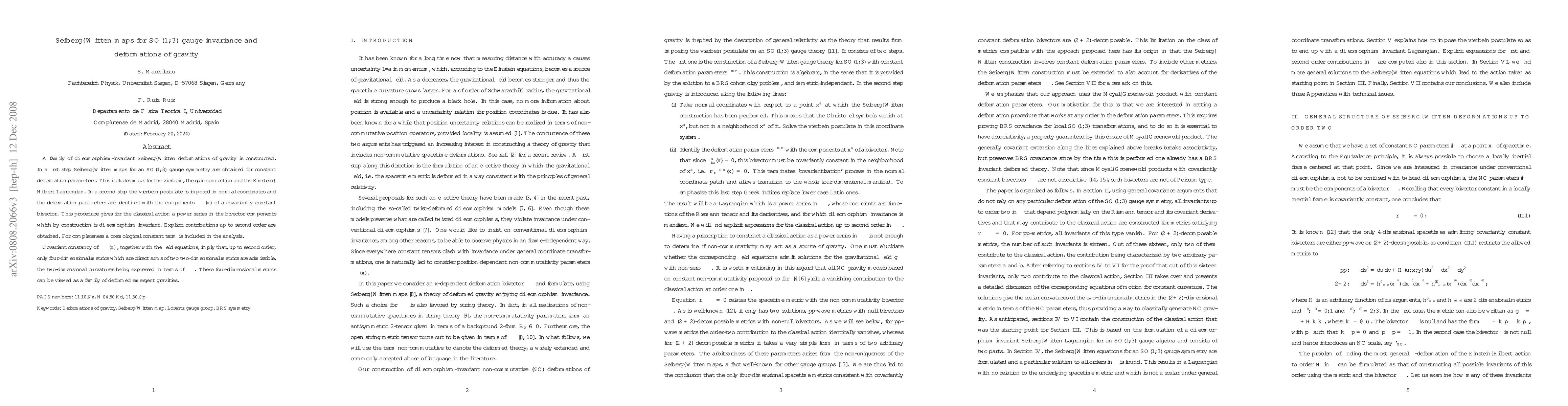 This paper constructs diffeomorphism-invariant Seiberg-Witten deformations of gravity, obtaining Seiberg-Witten maps for SO(1,3) gauge symmetry and identifying deformation parameters with components of a covariantly constant bivector, resulting in four-dimensional metrics as deformed emergent gravities.