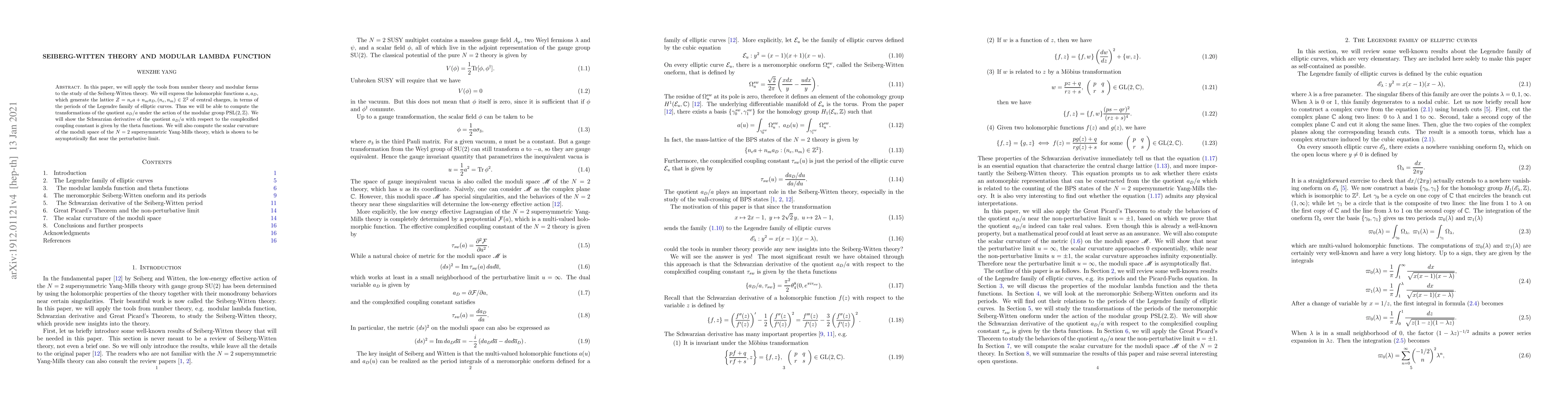 In this paper, we will apply the tools from number theory and modular forms to the study of the Seiberg-Witten theory. We will express the holomorphic functions $a, a_D$, which generate the lattice $Z=n_e a+n_m a_D, (n_e, n_m) \in \mathbb{Z}^2$ of central charges, in terms of the periods of the Legendre family of elliptic curves. Thus we will be able to compute the transformations of the quotient $a_D/a$ under the action of the modular group $\text{PSL}(2,\mathbb{Z})$. We will show the Schwarzian derivative of the quotient $a_D/a$ with respect to the complexified coupling constant is given by the theta functions. We will also compute the scalar curvature of the moduli space of the $N=2$ supersymmetric Yang-Mills theory, which is shown to be asymptotically flat near the perturbative limit.