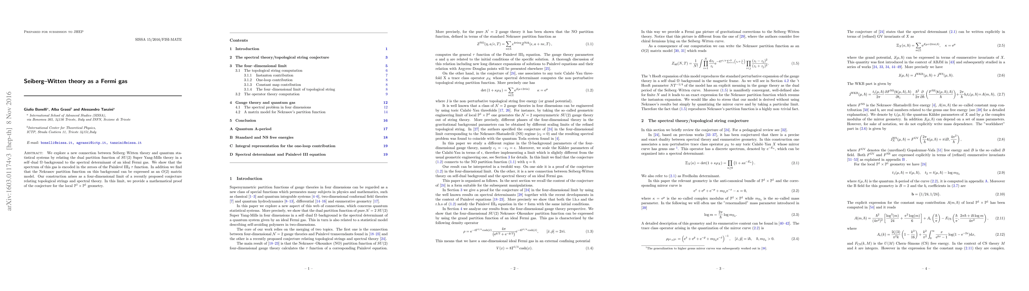 This paper establishes a novel link between Seiberg-Witten theory and quantum statistical systems by equating the dual partition function of SU(2) Super Yang-Mills theory in a self-dual Omega-background to the spectral determinant of an ideal Fermi gas, with the spectrum encoded in the zeroes of the Painleve III tau function. It also proves a conjecture relating topological strings and spectral theory in a four-dimensional limit for the local P1xP1 geometry.