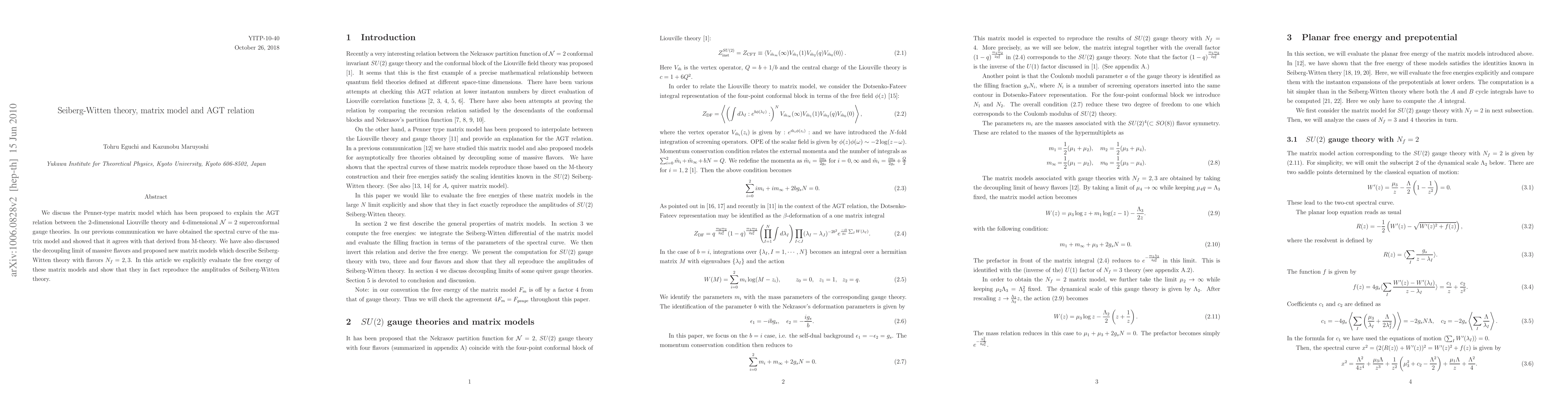 We discuss the Penner-type matrix model which has been proposed to explain the AGT relation between the 2-dimensional Liouville theory and 4-dimensional N=2 superconformal gauge theories. In our previous communication we have obtained the spectral curve of the matrix model and showed that it agrees with that derived from M-theory. We have also discussed the decoupling limit of massive flavors and proposed new matrix models which describe Seiberg-Witten theory with flavors N_f=2,3. In this article we explicitly evaluate the free energy of these matrix models and show that they in fact reproduce the amplitudes of Seiberg-Witten theory.