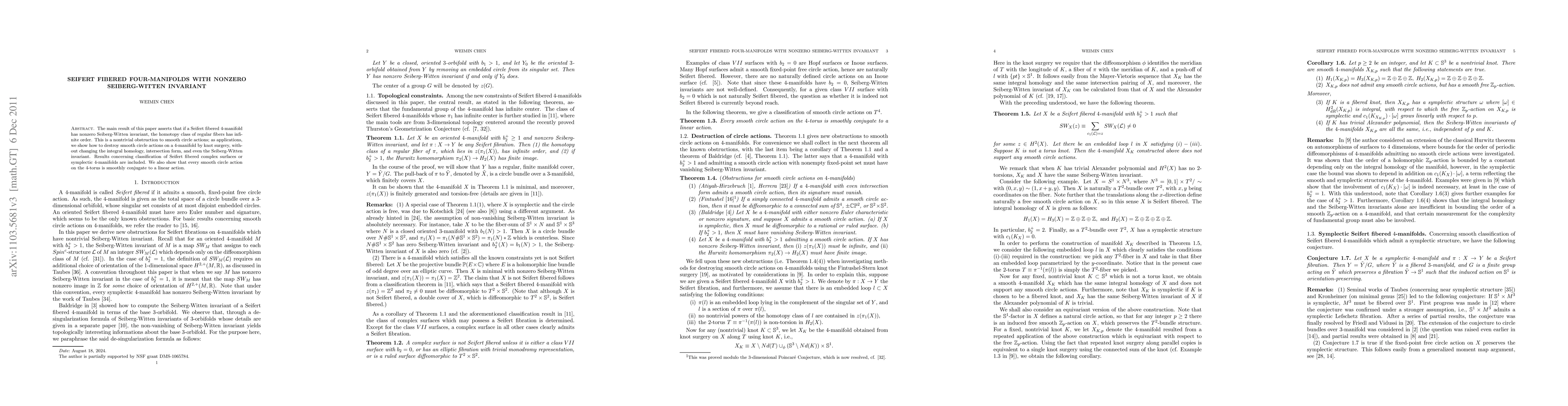 This paper proves that Seifert fibered 4-manifolds with nonzero Seiberg-Witten invariant cannot have regular fibers of finite order, obstructing smooth circle actions. It also demonstrates how to eliminate such actions via knot surgery while preserving homology, intersection form, and Seiberg-Witten invariant.