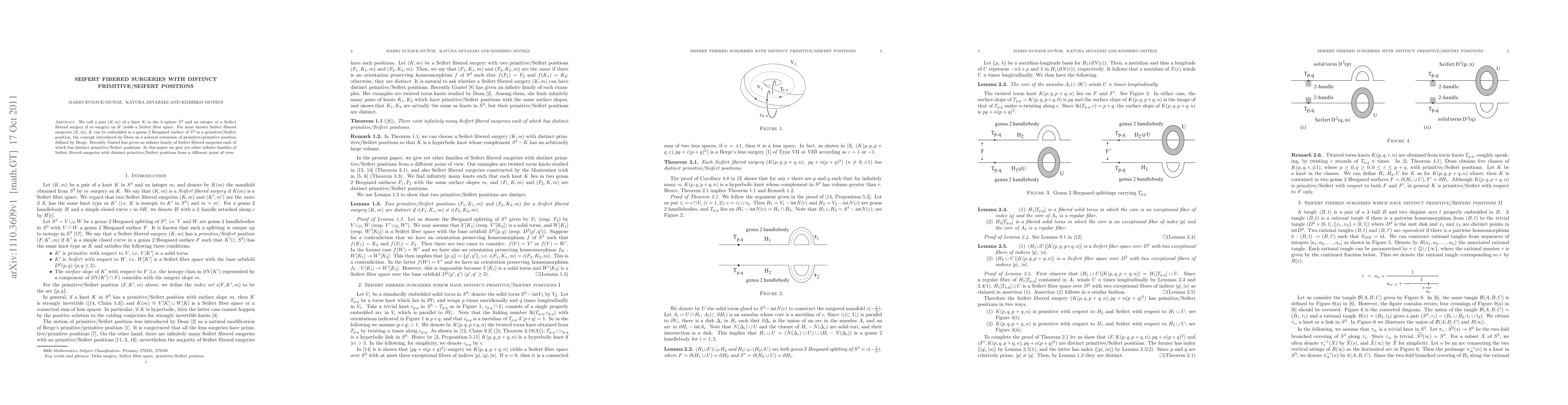 We call a pair (K, m) of a knot K in the 3-sphere S^3 and an integer m a Seifert fibered surgery if m-surgery on K yields a Seifert fiber space. For most known Seifert fibered surgeries (K, m), K can be embedded in a genus 2 Heegaard surface of S^3 in a primitive/Seifert position, the concept introduced by Dean as a natural extension of primitive/primitive position defined by Berge. Recently Guntel has given an infinite family of Seifert fibered surgeries each of which has distinct primitive/Seifert positions. In this paper we give yet other infinite families of Seifert fibered surgeries with distinct primitive/Seifert positions from a different point of view. In particular, we can choose such Seifert surgeries (K, m) so that K is a hyperbolic knot whose complement S^3 - K has an arbitrarily large volume.