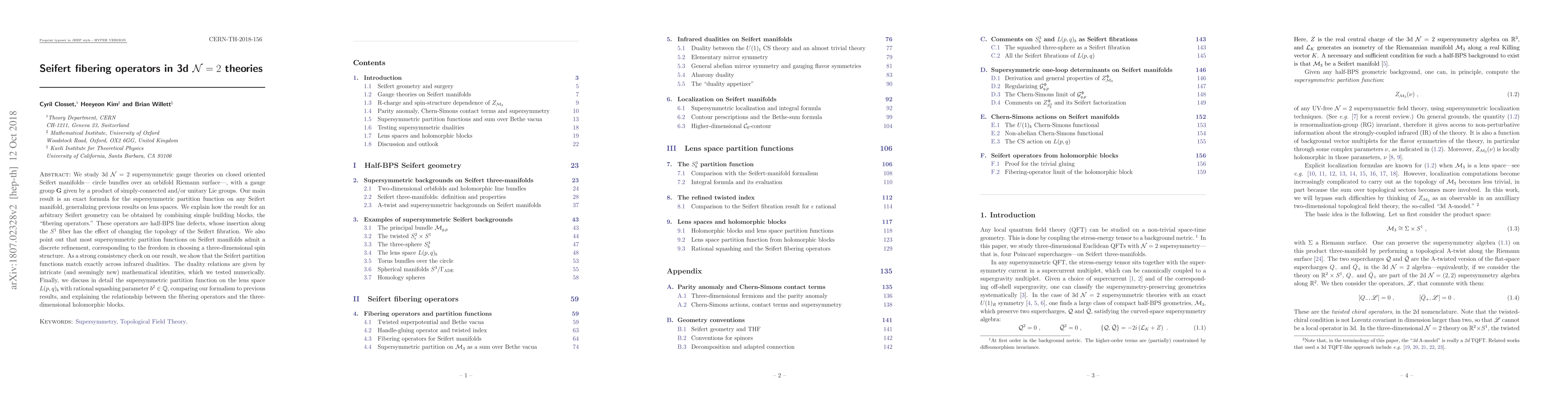 We study 3d $\mathcal{N}=2$ supersymmetric gauge theories on closed oriented Seifert manifold---circle bundles over an orbifold Riemann surface---, with a gauge group G given by a product of simply-connected and/or unitary Lie groups. Our main result is an exact formula for the supersymmetric partition function on any Seifert manifold, generalizing previous results on lens spaces. We explain how the result for an arbitrary Seifert geometry can be obtained by combining simple building blocks, the "fibering operators." These operators are half-BPS line defects, whose insertion along the $S^1$ fiber has the effect of changing the topology of the Seifert fibration. We also point out that most supersymmetric partition functions on Seifert manifolds admit a discrete refinement, corresponding to the freedom in choosing a three-dimensional spin structure. As a strong consistency check on our result, we show that the Seifert partition functions match exactly across infrared dualities. The duality relations are given by intricate (and seemingly new) mathematical identities, which we tested numerically. Finally, we discuss in detail the supersymmetric partition function on the lens space $L(p,q)_b$ with rational squashing parameter $b^2 \in \mathbb{Q}$, comparing our formalism to previous results, and explaining the relationship between the fibering operators and the three-dimensional holomorphic blocks.