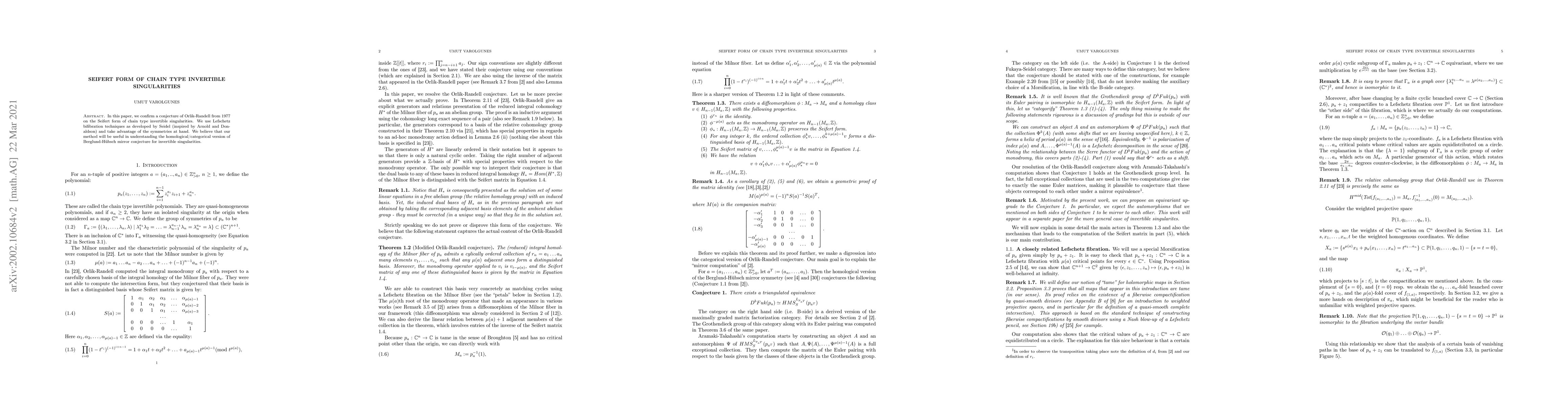 In this paper, we confirm a conjecture of Orlik-Randell from 1977 on the Seifert form of chain type invertible singularities. We use Lefschetz bifibration techniques as developed by Seidel (inspired by Arnold and Donaldson) and take advantage of the symmetries at hand. We believe that our method will be useful in understanding the homological/categorical version of Berglundt-Hubsch mirror conjecture for invertible singularities.