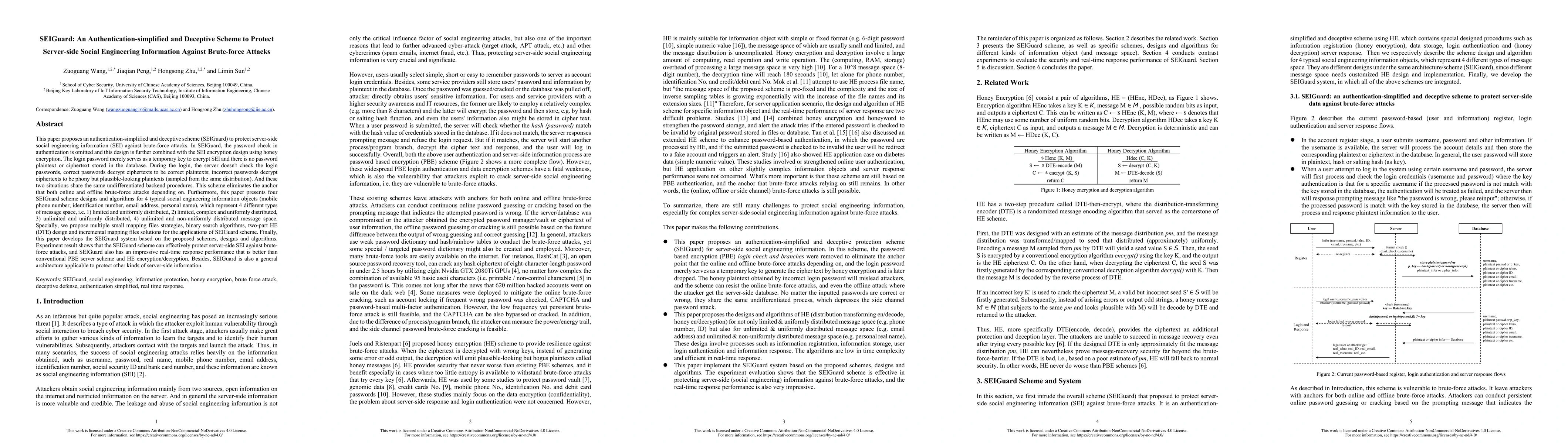 SEIGuard proposes an authentication-simplified and deceptive scheme to protect server-side social engineering information against brute-force attacks by omitting password checks and employing honey encryption, effectively thwarting both online and offline attacks. The system uses temporary keys for encryption without storing password plaintext or ciphertext, and demonstrates effective protection and real-time performance.